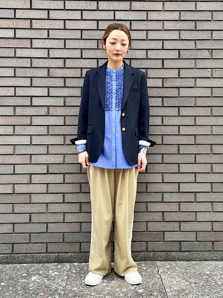 素材感・着心地:コットンのややハリのある素材感。フロントのフリルがポイントになるので、ジャケットやカーディガンのインナーにオススメです