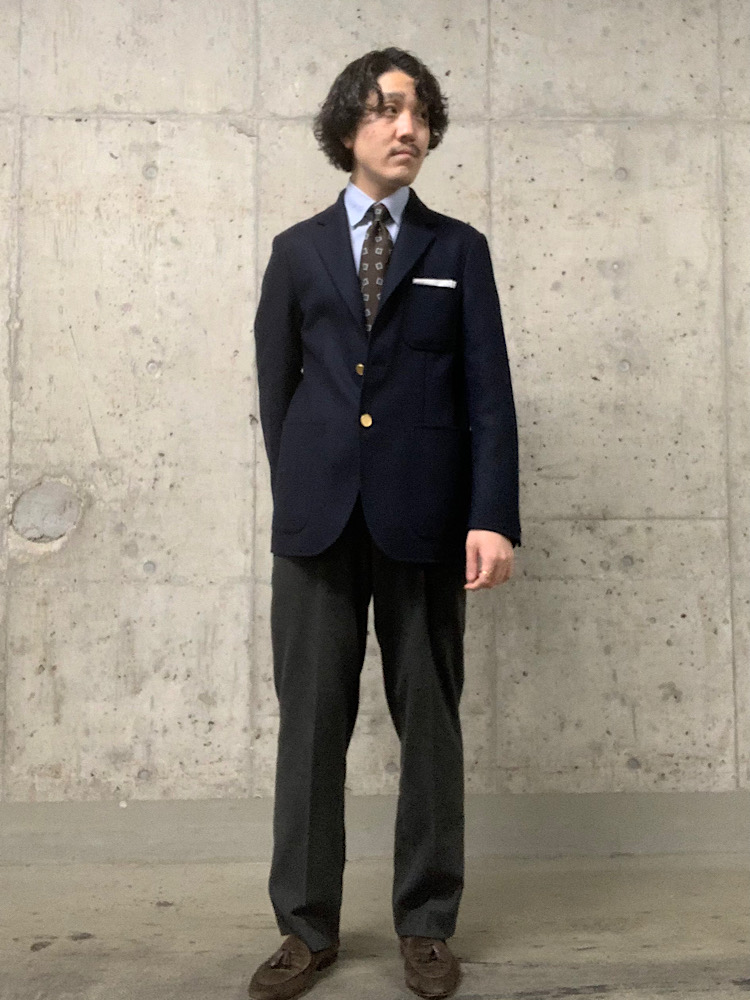 通勤スタイルにおすすめなネイビー×ブラウンの組み合わせです。