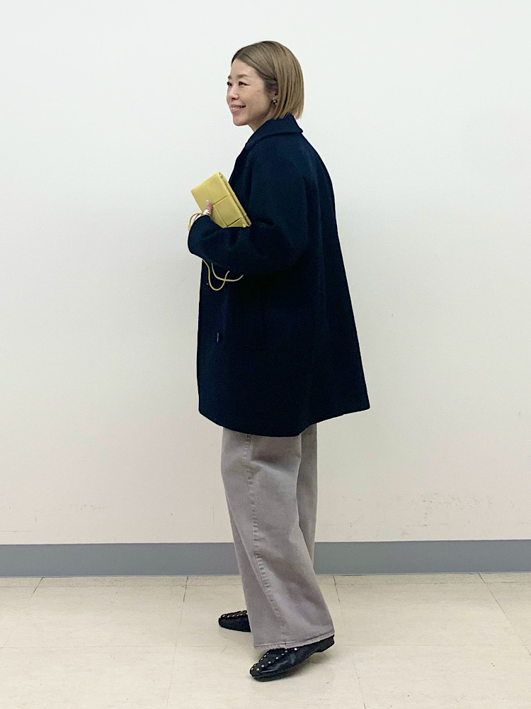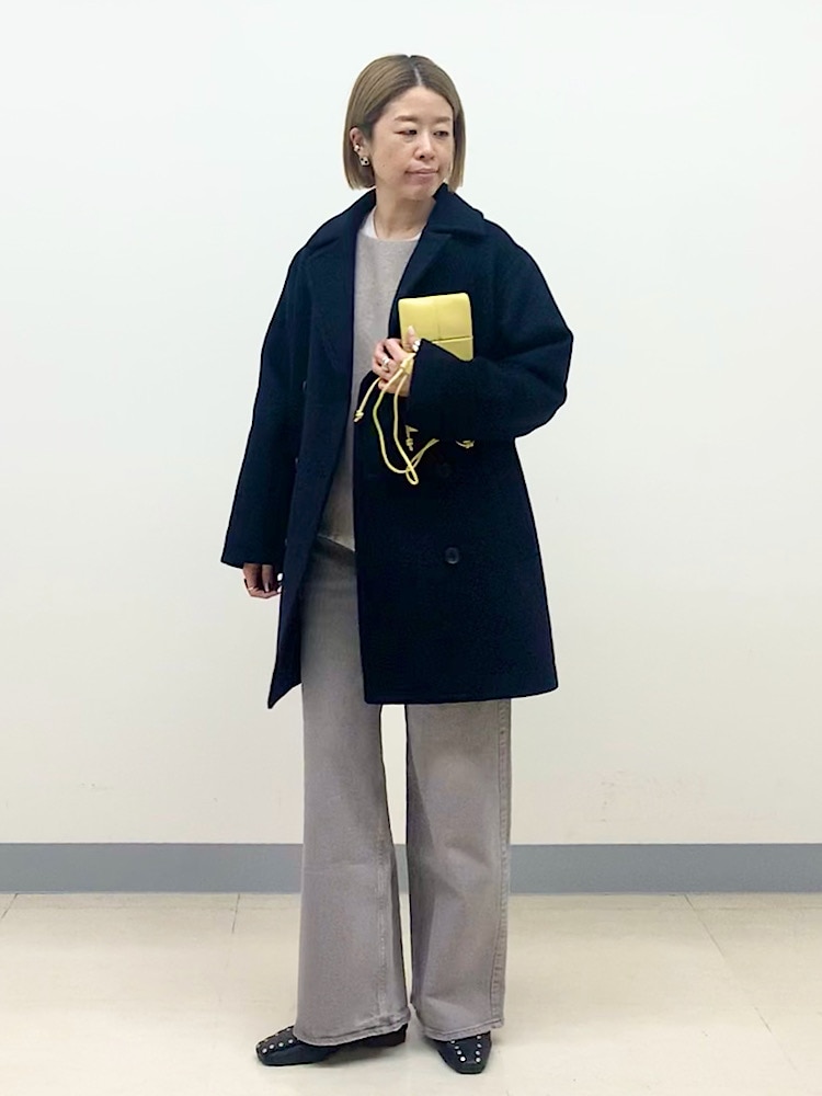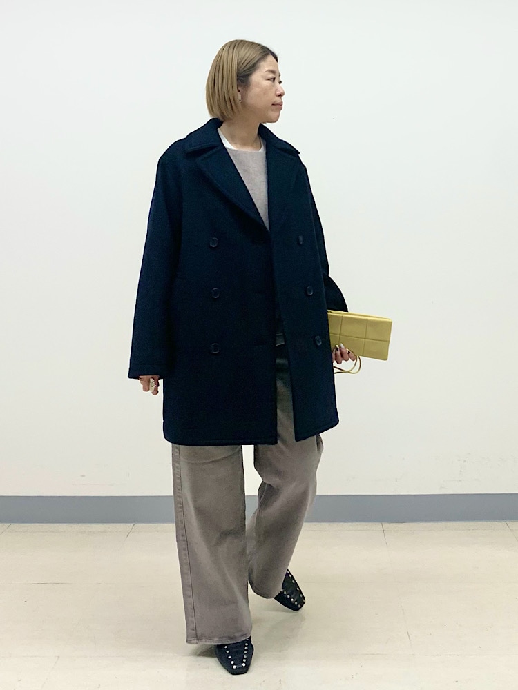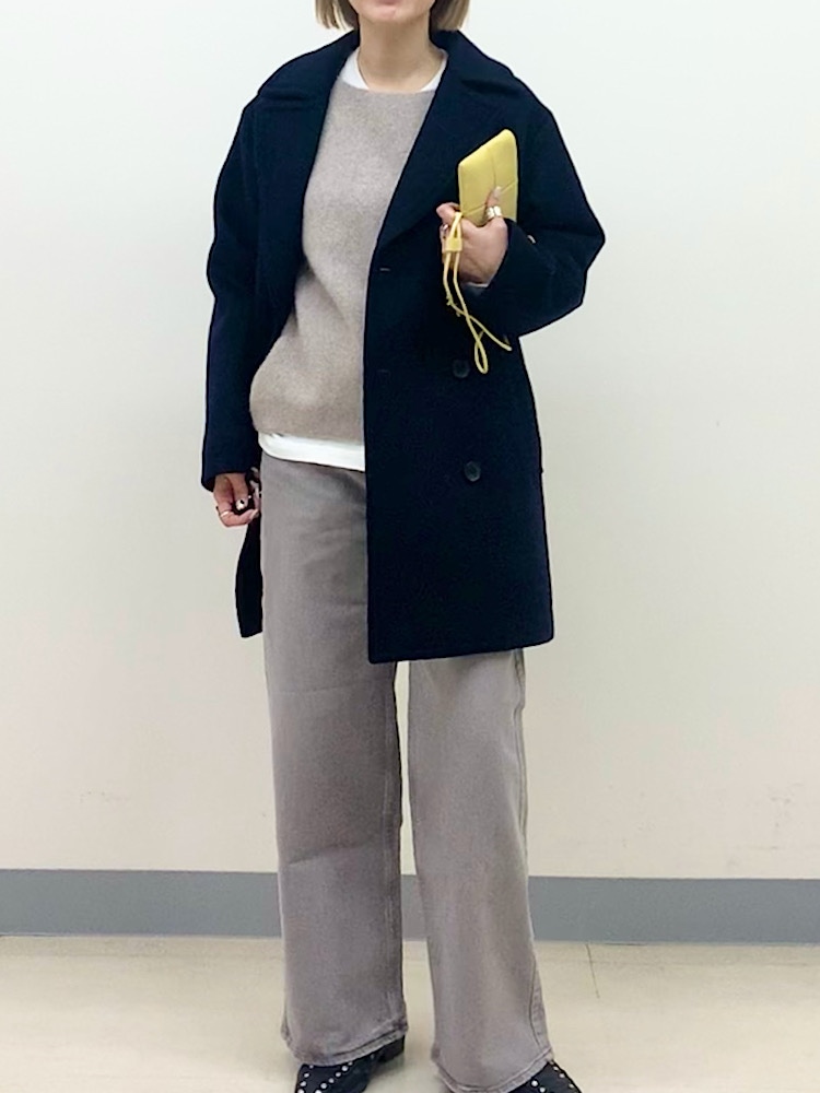 インナーはグレージュのワントーンで統一。Pコートでも幼く見えないコーディネートになります。