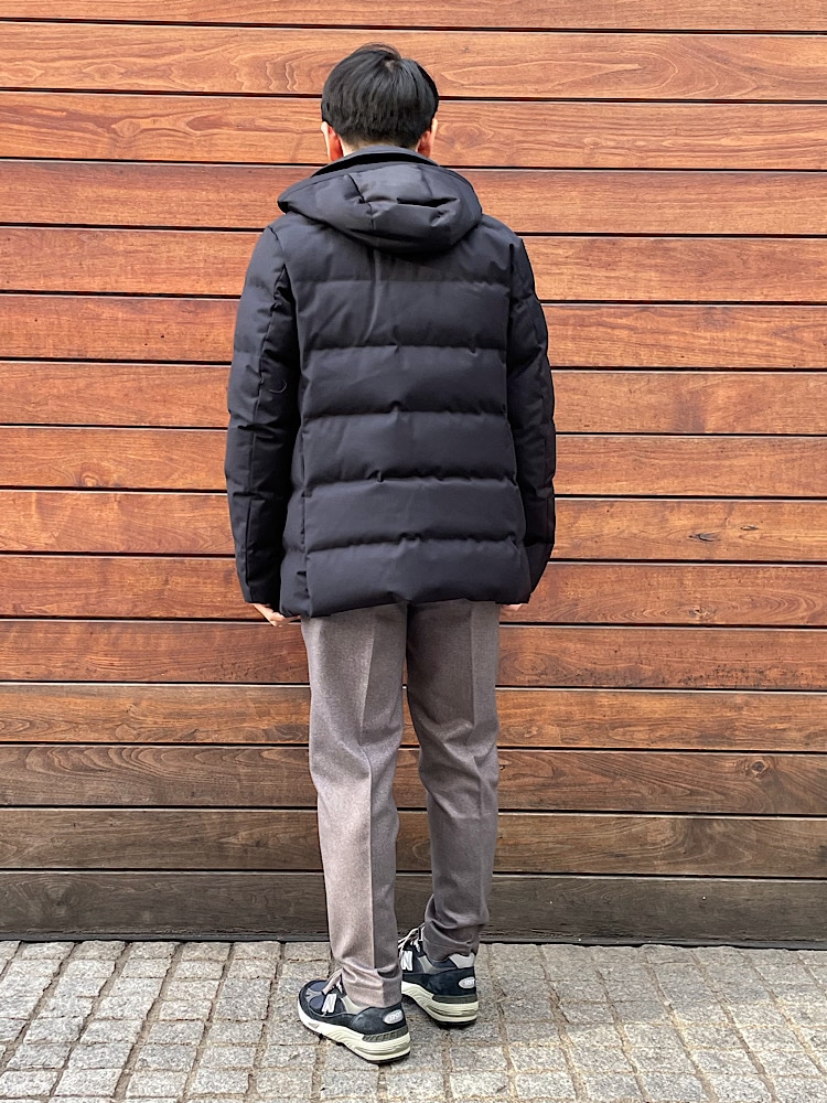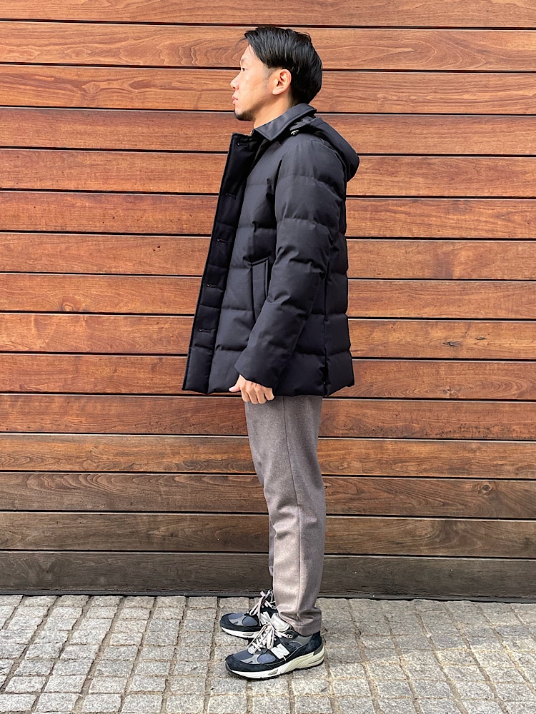 素材感/着心地:表地はウールポリエステルの合繊素材。ダウン90%フェザー10%で軽くて暖かい。