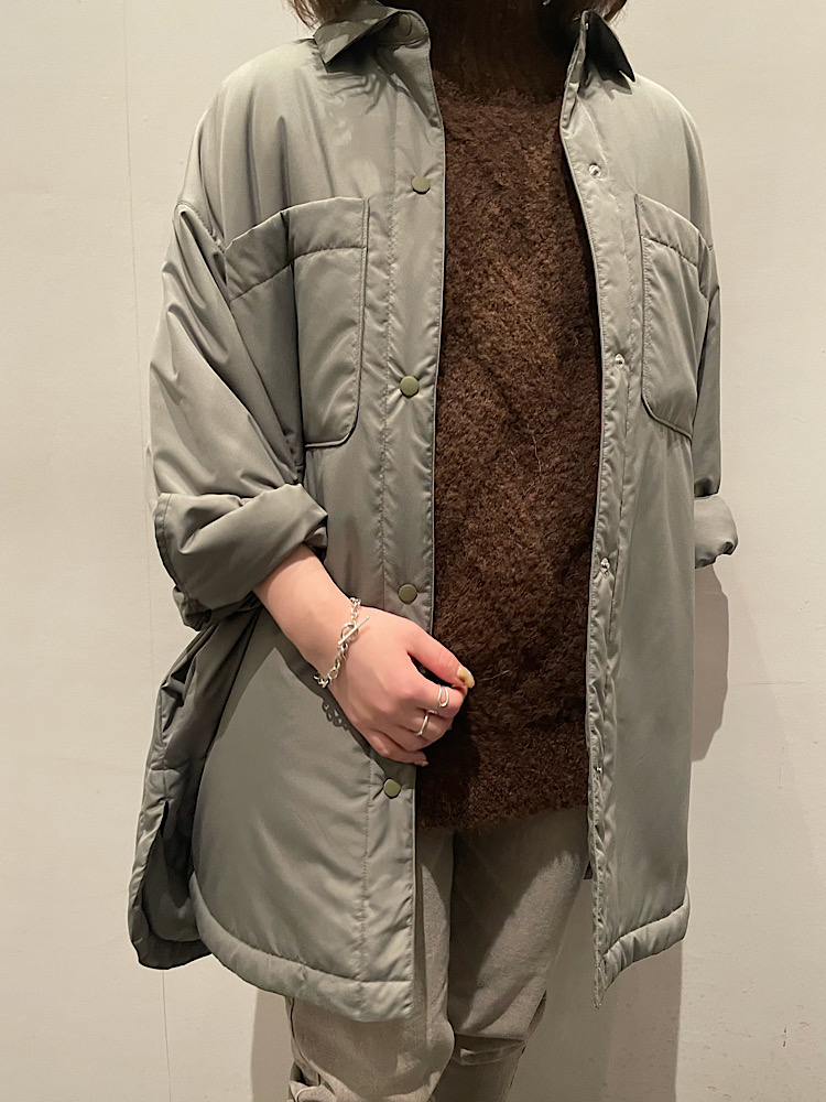 商品紹介:シャツ型の中綿アウターでデザインが珍しく1枚で決まるアイテムです。使用ナイロンも柔らかく身体のラインに綺麗に沿ってくれます。カジュアルな合わせでも可愛いです。
