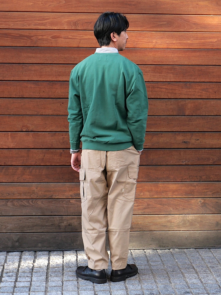 カレッジロゴスウェットのご紹介です。綺麗なグリーンで春先にも活躍しそうです。ビンテージ調のラバープリントも特徴です。