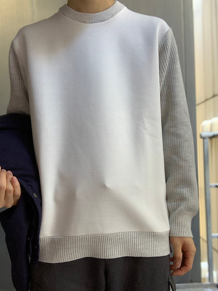 素材感: ボディにはダンボール生地のスウェット、袖・後身頃には7Gの片畔ニットを使用。