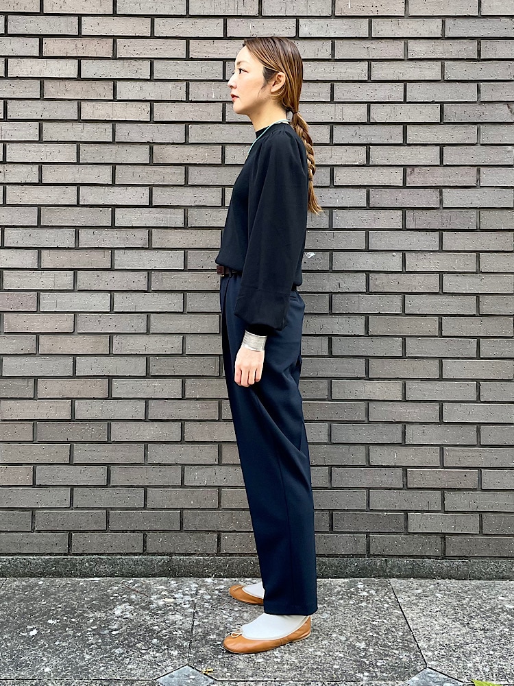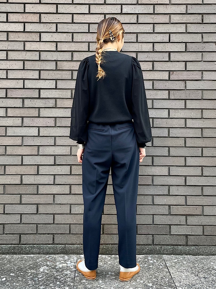 素材感・着心地:コットン/ポリエステル素材のハイゲージのニットです。袖部分はチュール素材になっており透け感がありますが、内側はニット素材になっている為、肌は透けません。コンパクトなサイズ感なので、ボリュームのあるボトムとの相性が良いです