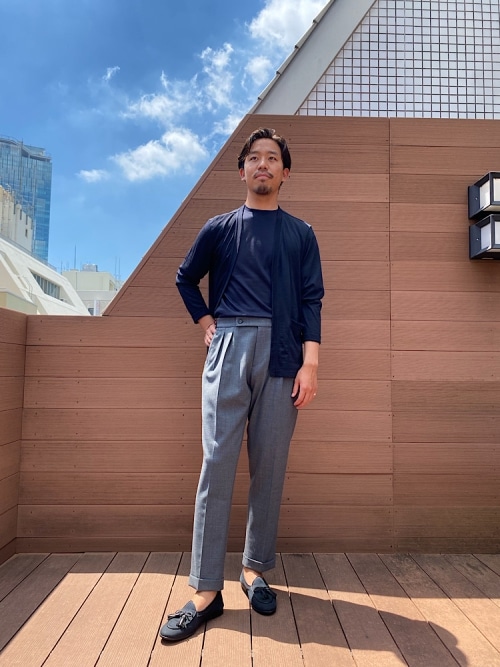 【素材感・着心地】ハリがありキッチリ見えるダンガリー、着心地はシャリ感はありますが硬さは感じません。