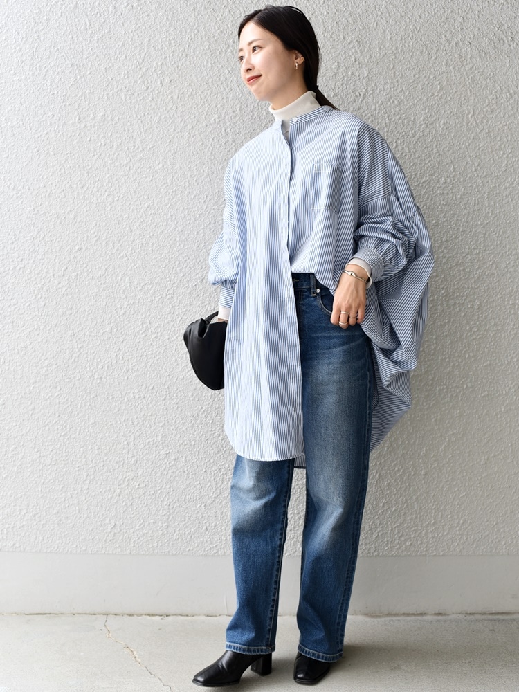 デニムに裾の片側をウエストインして、程良いメリハリをつけた大人カジュアルコーデ。