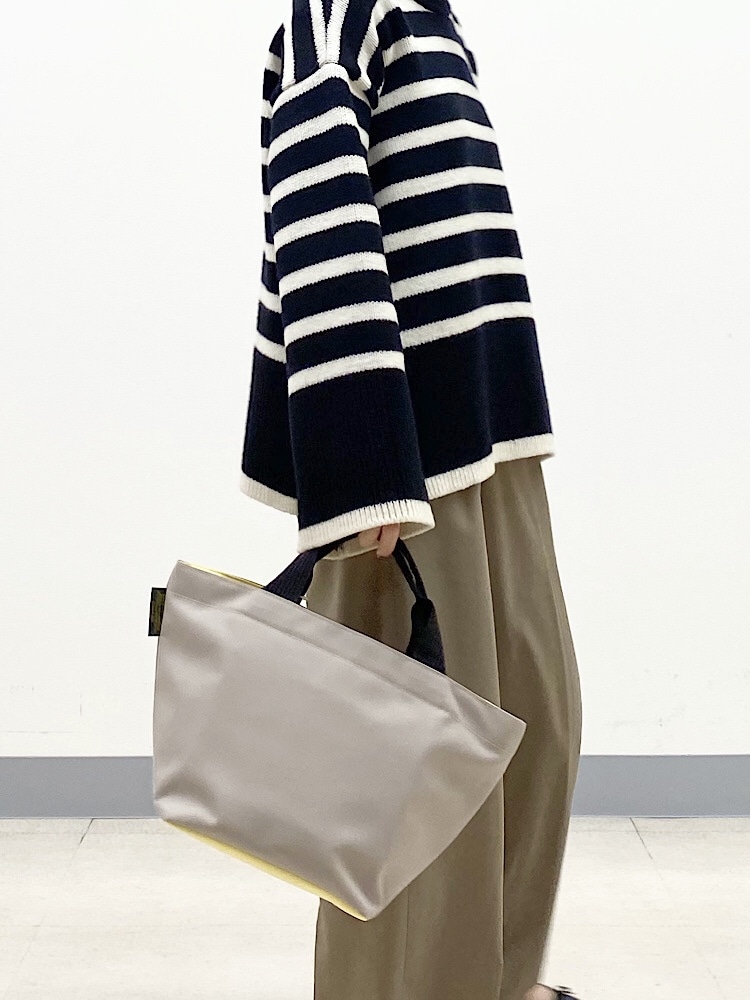 素材感・着心地:ウール素材のざっくりしたニット。太めのボーダーが特徴的で、一枚で存在感のあるニット。