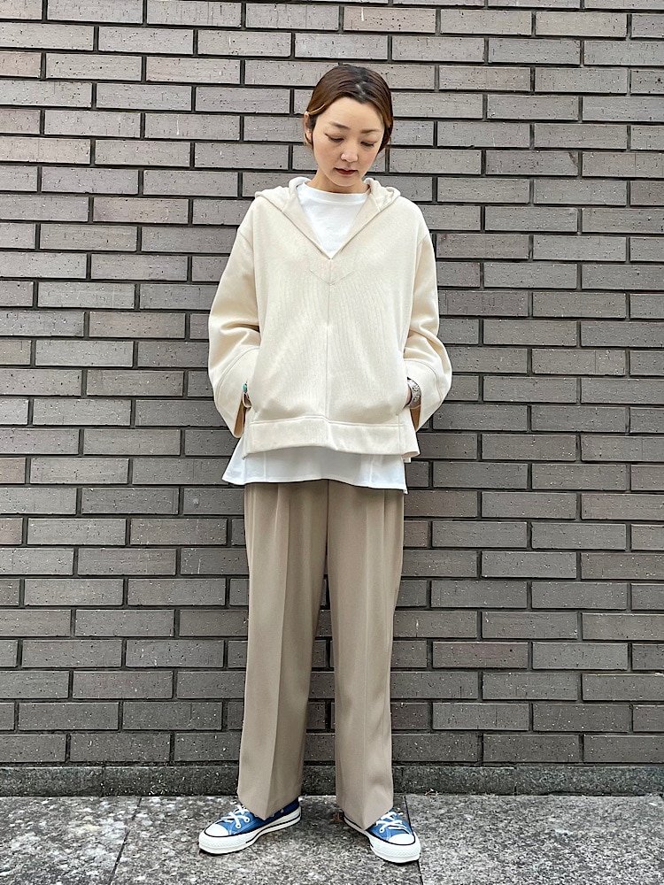 素材感・着心地:ポリエステルのさらりとした素材感。ストレッチも効いており着用しやすいです。セミワイドで落ち感のある綺麗なシルエットです