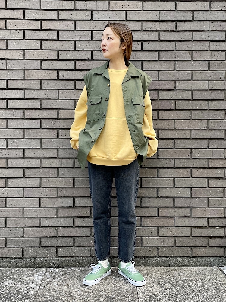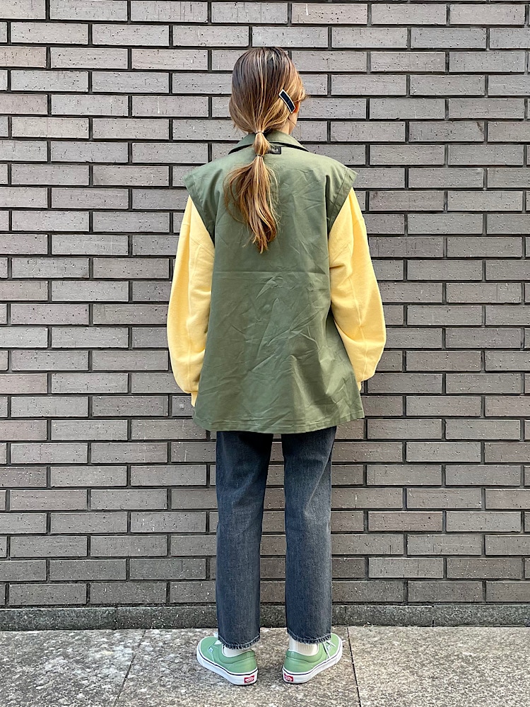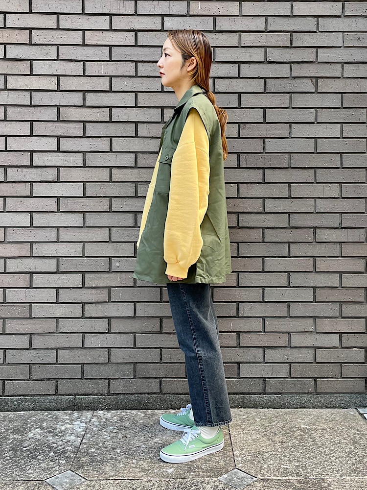 素材感・着心地:コットンの様な少しハリのある素材感(デッドSTOCKのシャツを使用している為、素材表記なし)身幅はゆったりしており、厚手のインナーの上からも着用が可能です。上3つはVINTAGEのボタンを使用しておりアソートになっています