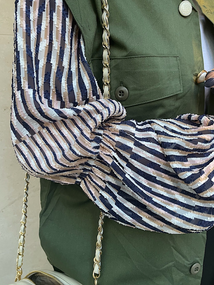 着心地:袖部分の異素材がポイント。上品な透け感があり、一枚でおしゃれに決まるカットソーです。