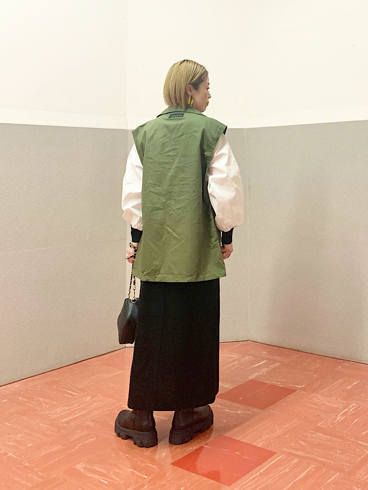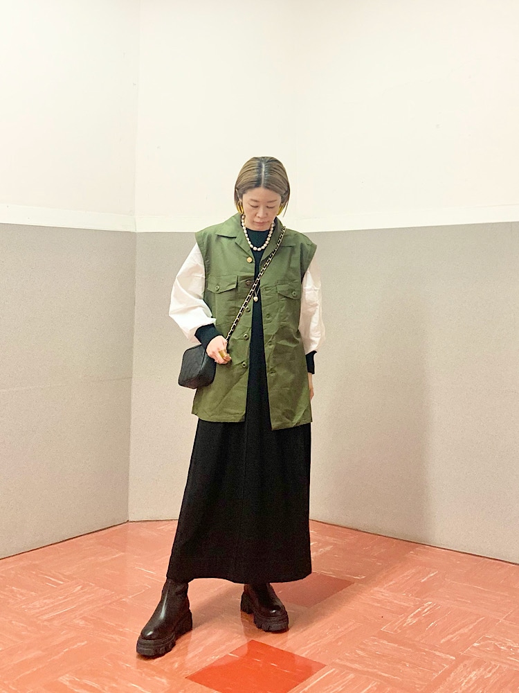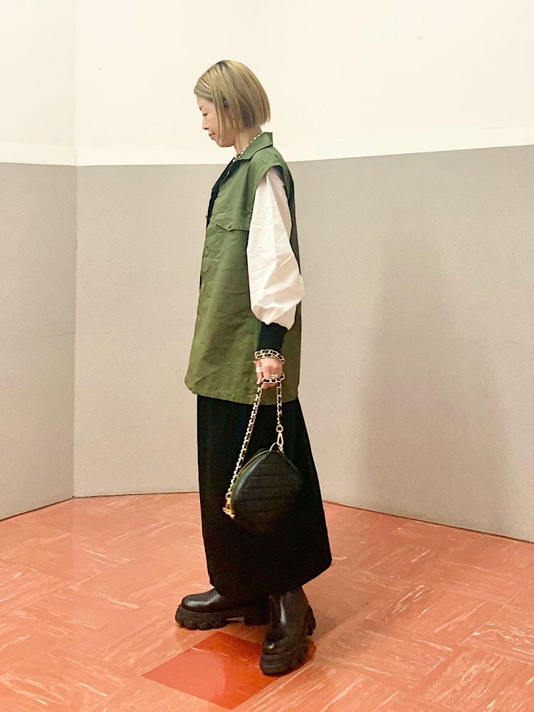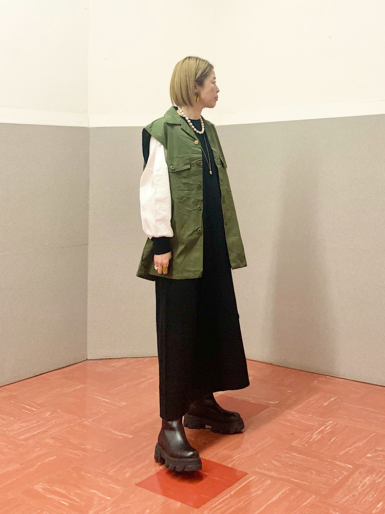 ミリタリー、エレガント、カジュアル、と様々なテイストをミックスしたコーディネート。