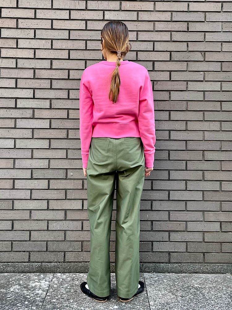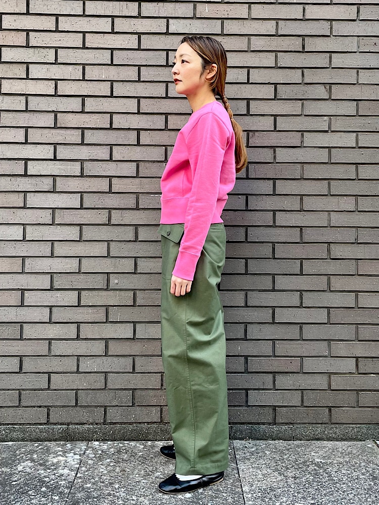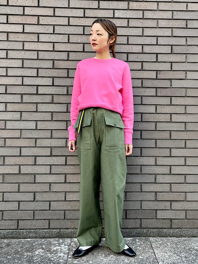 素材感・着心地:薄手のコットン素材。股上が深く、ハイウエストで着用すると脚長効果、ストンとした落ち感を楽しめます。コンパクトなトップスを合わせると腰周りのポケットもポイントになり可愛いです。トップスがコンパクトになるほど、ボトムのボリューム感が際立つスタイリングになります