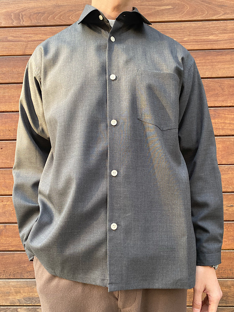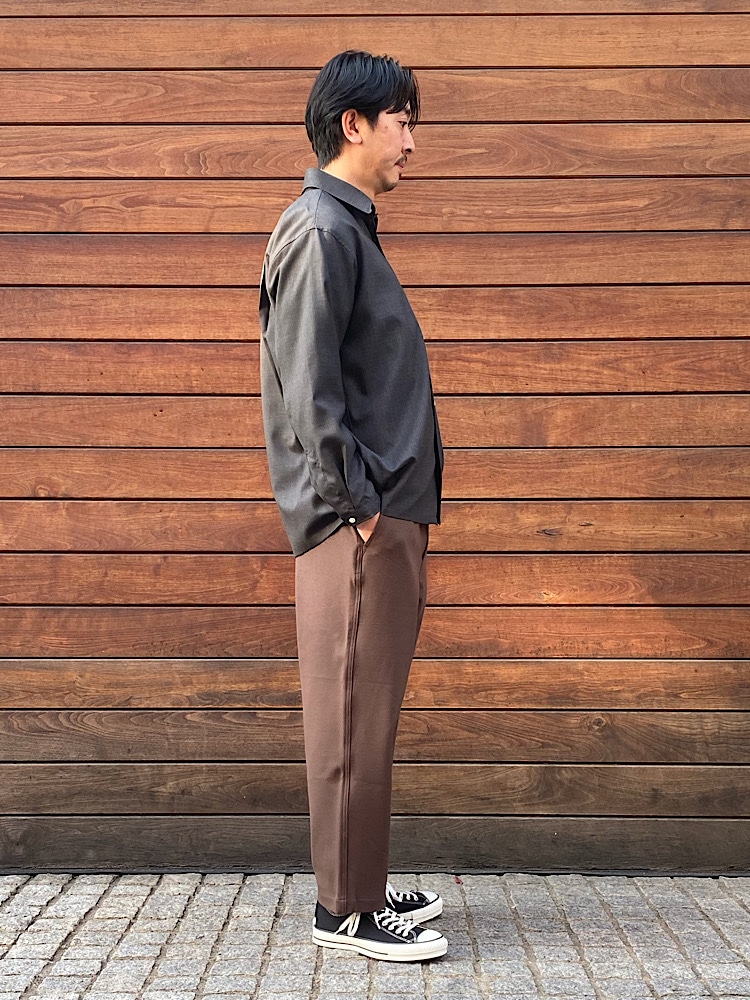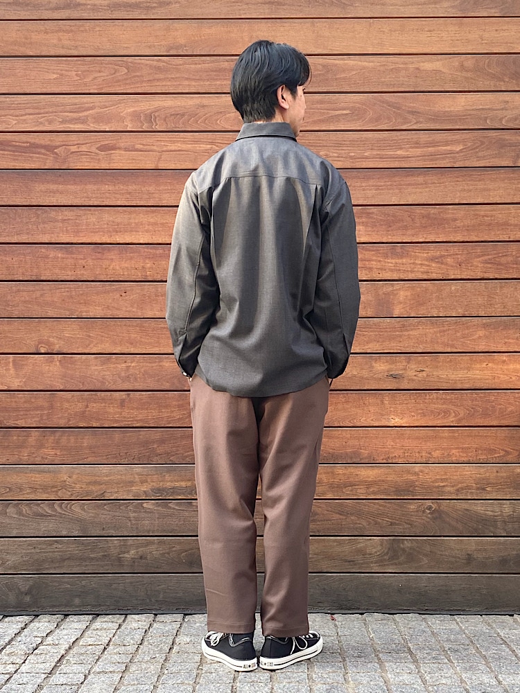 リラックスシルエットのウールシャツをコーディネートしました。ワイドパンツを合わせてシルエットを揃えています。足下はスニーカーでカジュアル感を出しました。