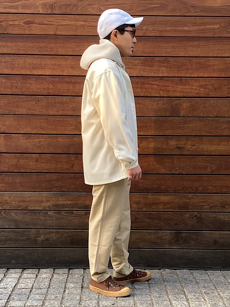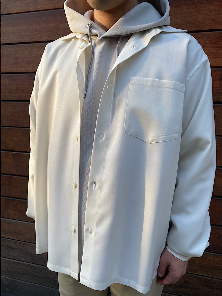 素材感/着心地:トップスの上からも着て頂ける、羽織りにも適したシャツです。これから春先にむけて、さわやかなコーディネートにお使い頂けます。