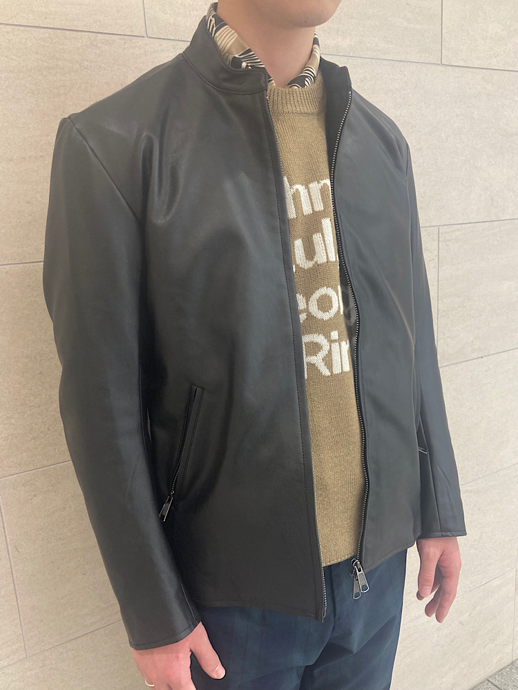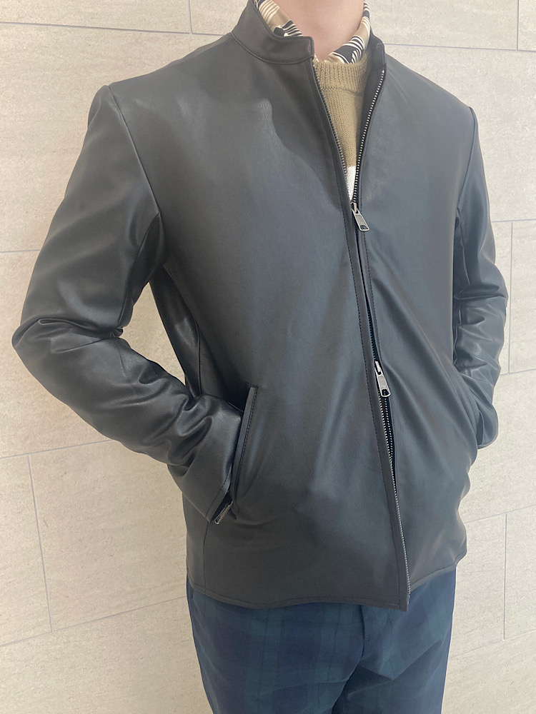 【素材感・着心地】フェイクレザーを使用したSHIPSの定番ライダース。丈、シルエットはやや細身なのでスタイリッシュな印象に。