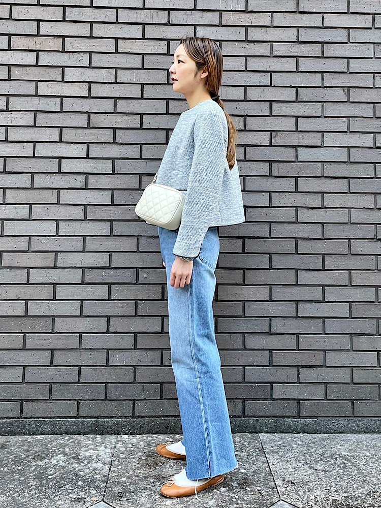 素材感・着心地:コットン/ポリエステルの軽い素材感。裏地が付いており袖通しもスムーズです。コンパクトなサイズ感なのでボリュームのあるボトムやワンピースなどとの相性が良いです