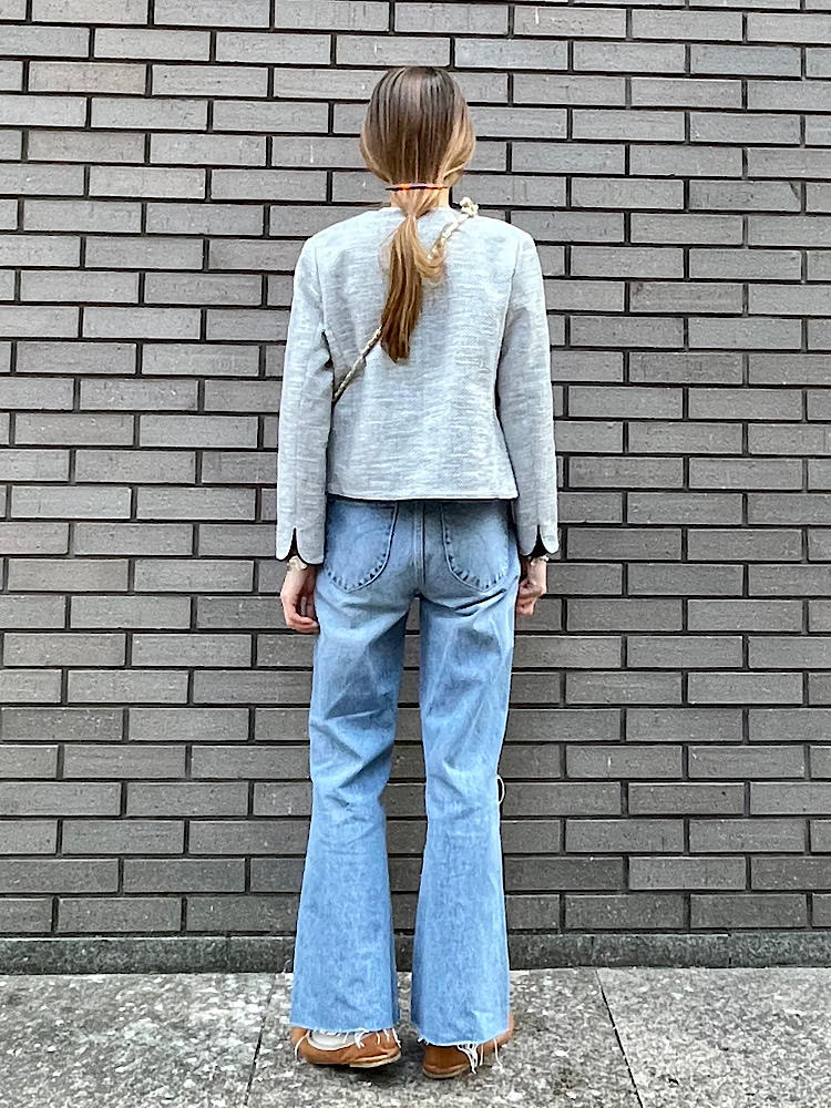 素材感・着心地:比較的ベーシックな厚さのデニム素材。腰周りはピッタリしており裾にかけて広がるフレアのシルエットです。※渋谷店限定ブランドなので、気になる方は渋谷店にお問い合わせください