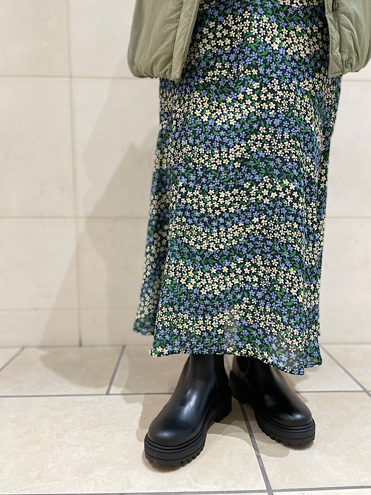 全体に散りばめられた小花柄が魅力的なスカートです。