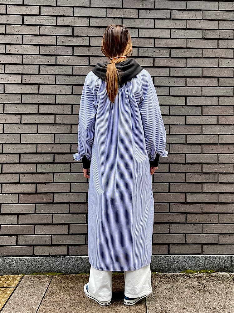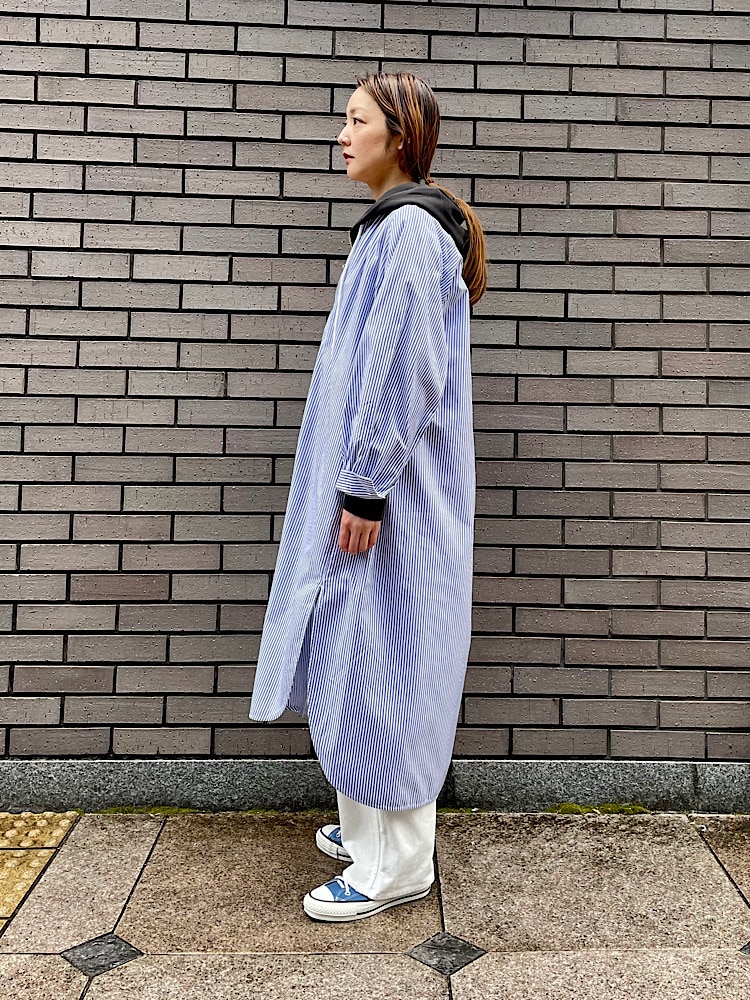 素材感・着心地:コットンのハリのある素材感。身幅、袖幅共にゆったりしてる為、インナーの重ね着や春先は前ボタンを外して羽織りとしても着用可能です