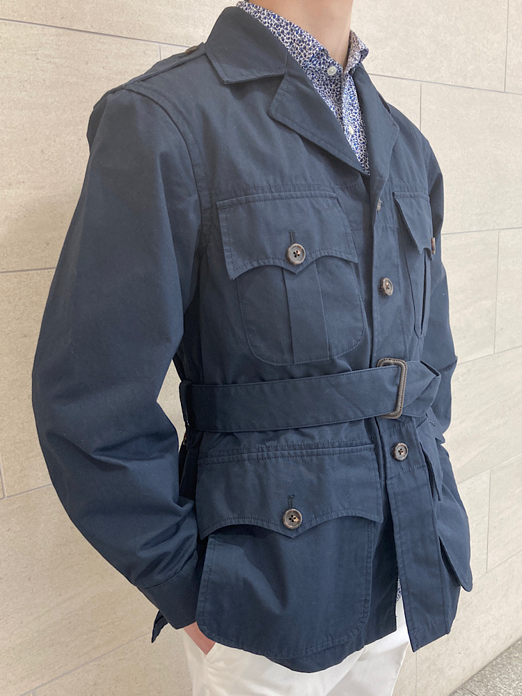 【素材感・着心地】ウィリス アンド ガイガーのサファリジャケット。シルエットは細身でスタイリッシュな印象。