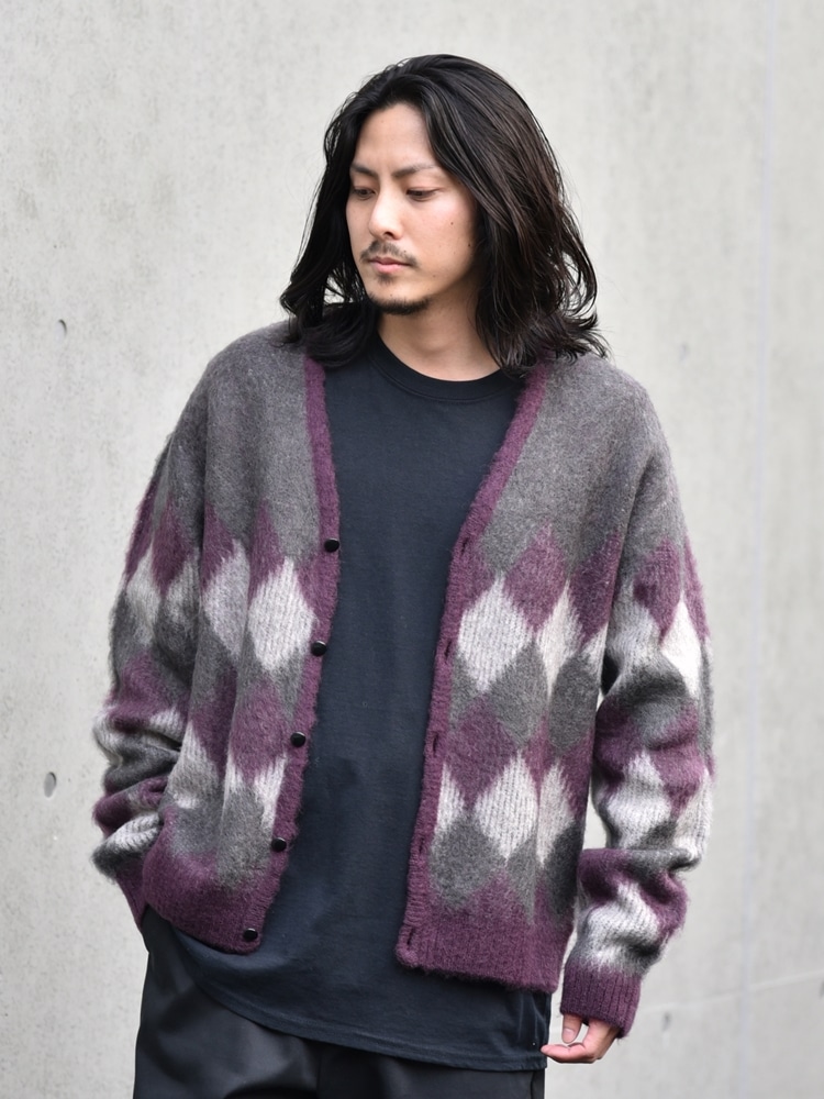 アーガイルのモヘアカーディガンをオールブラックで引き立てたネオトラスタイル