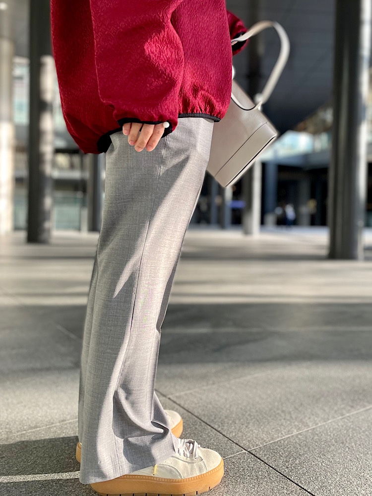 ・着こなしポイント: かっちりとした印象のパンツもスニーカー合わせだとカジュアル中着こなしに