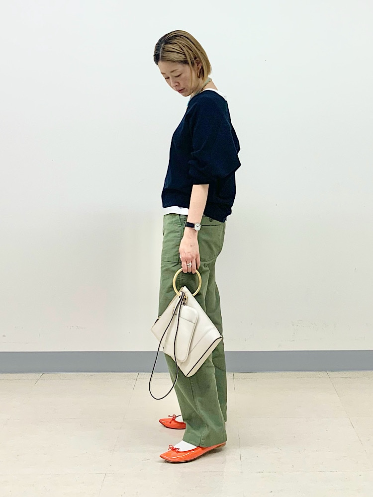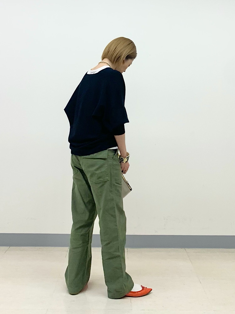 サイズ感:全体的に大き目。普段サイズよりワンサイズダウンでジャストか、ややゆとりが出るくらい。ハイウエストのデザインを、ワンサイズアップし、腰位置を落として履いています。丈は長めで裾上げしていますが、ロールアップで履いても可愛いです。
