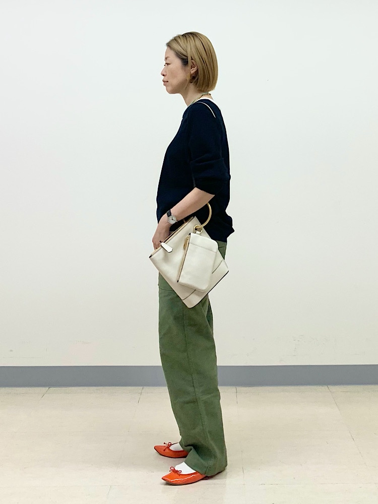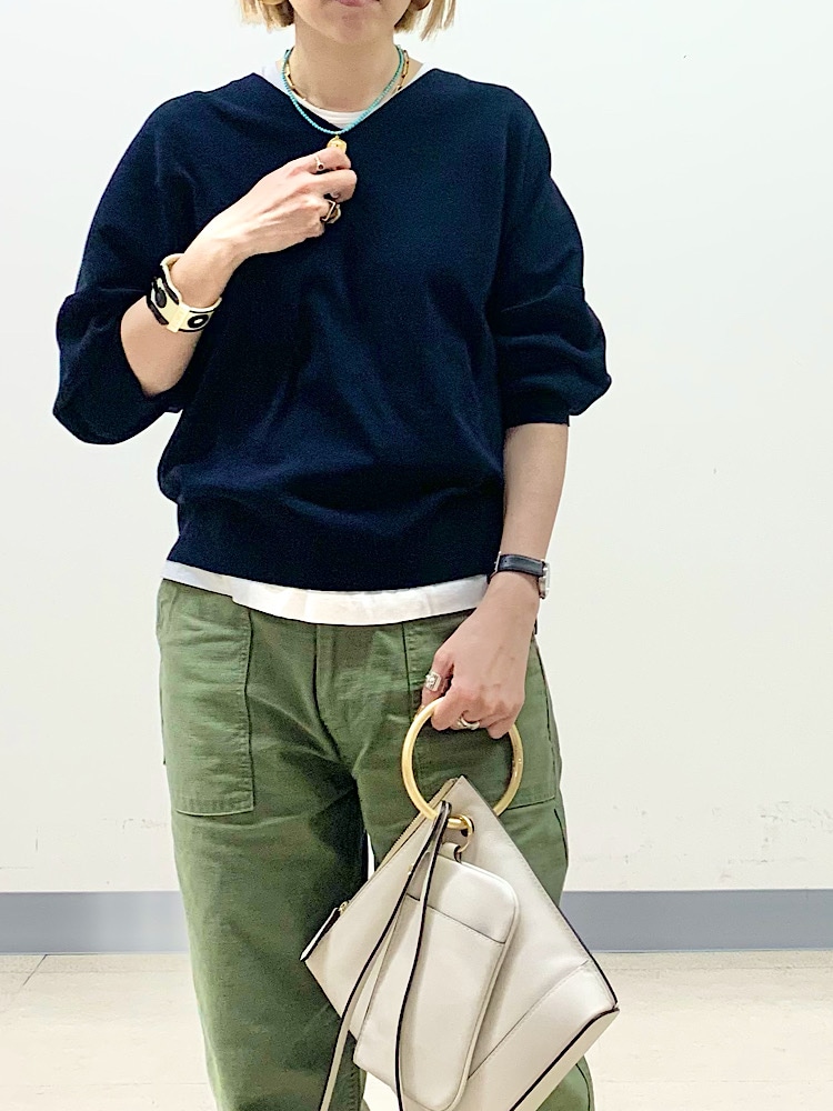 サイズ感:ややゆったり。裾にかけて細くなるシルエットなので、インにしなくてもすっきり決まる。襟ぐりも開き過ぎない。