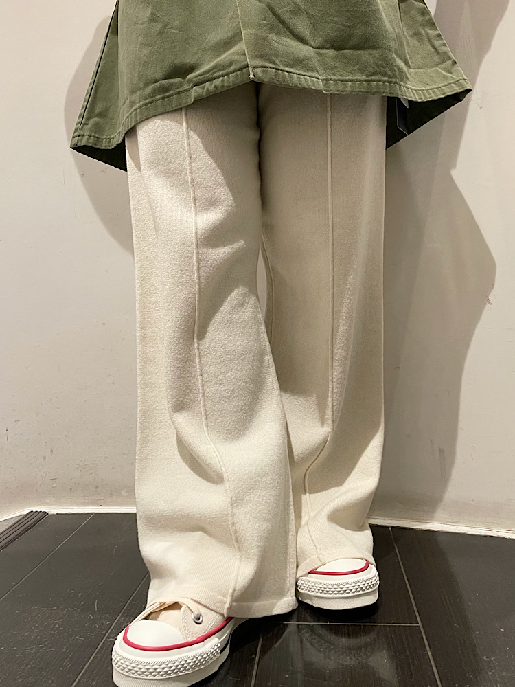 商品紹介:ウエストを1回ほど折って足の甲にかかるくらいの長さでした。センターに縫い目がある為足がスッキリ見えるシルエットでした。
