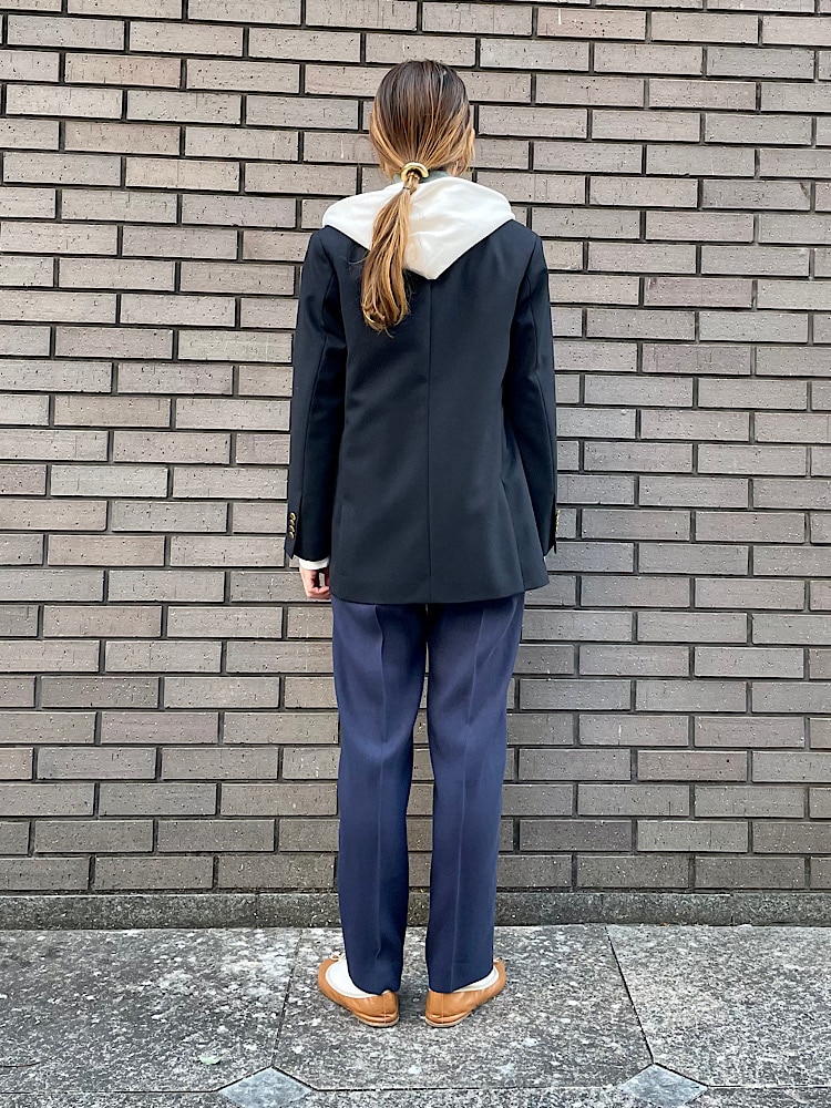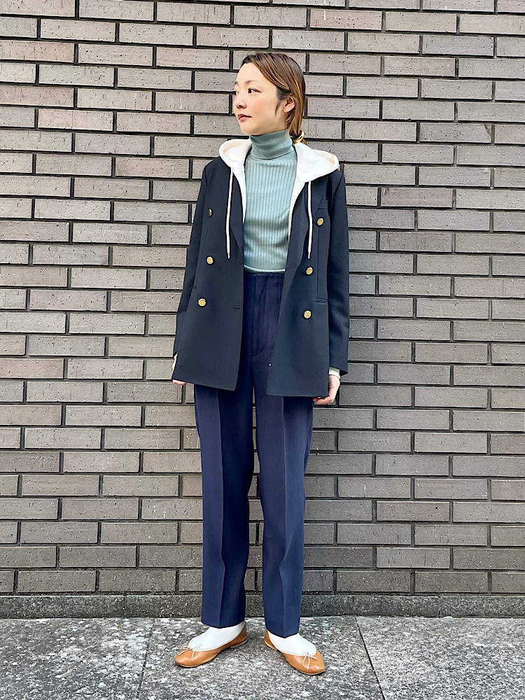 素材感・着心地:ウールのさらりとした素材感。袖裏のみ裏地が付いています。ダブルの仕様ですが開けても広がりすぎずスッキリと着用できるシルエットです