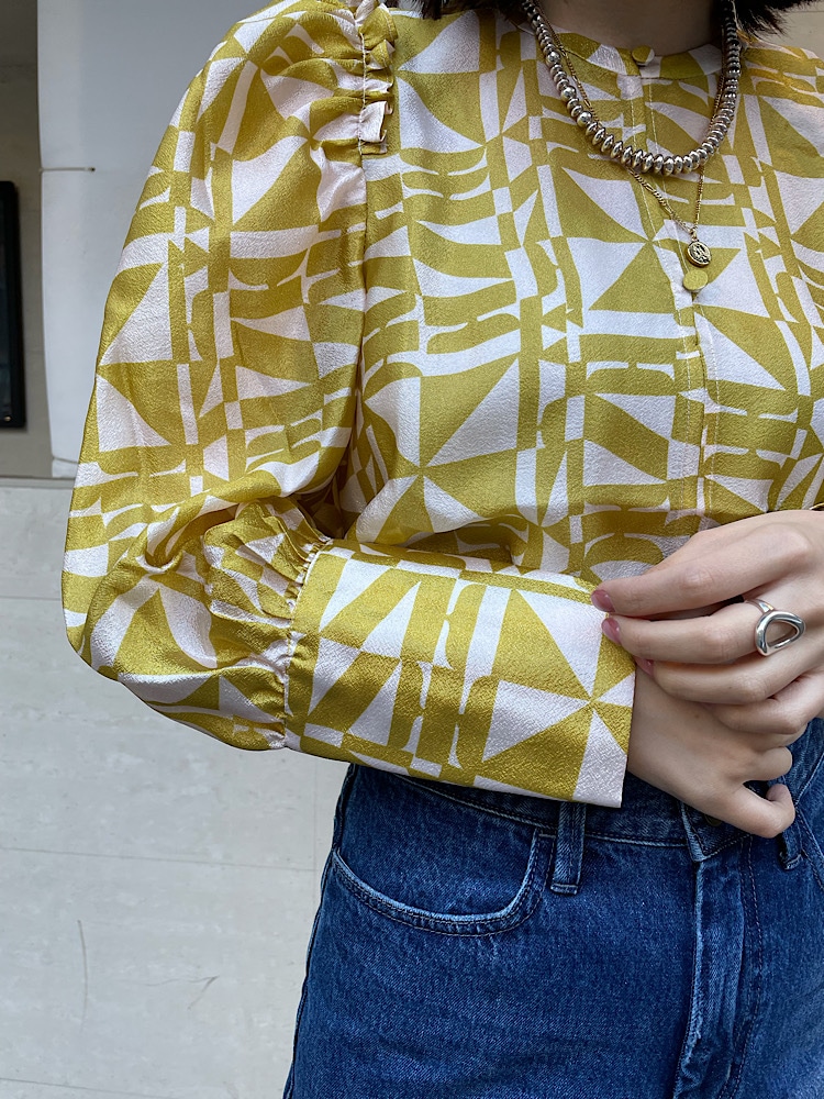 着心地:袖部分のたっぷりとしたボリューム感がポイントです。光沢感があり上品な印象なので、デニムでカジュアルに合わせました。