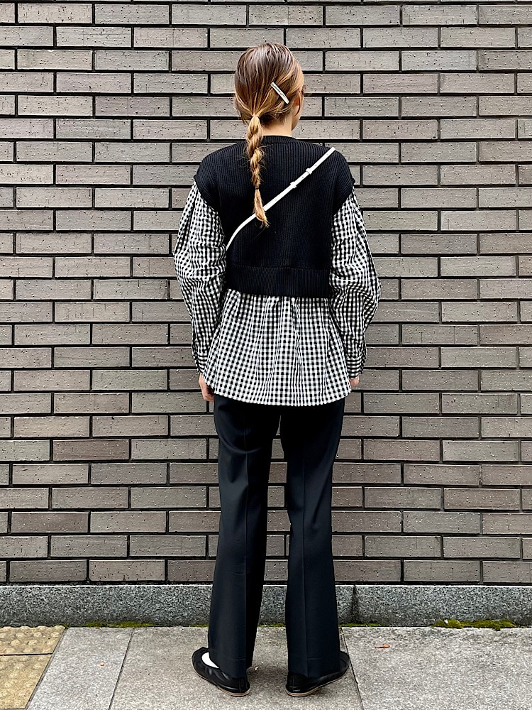 素材感・着心地:ポリエステル/コットン素材のニットとコットン素材のシャツ生地のコンビです。肩周りはゆったりしており着用しやすいです。着丈がやや長めなのでパンツとの相性が良いです