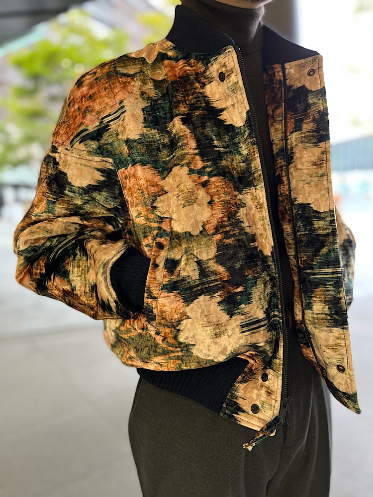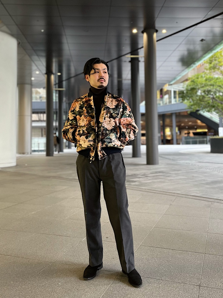 柄物のブルゾンをウールスラックスで綺麗めに合わせてみました。
