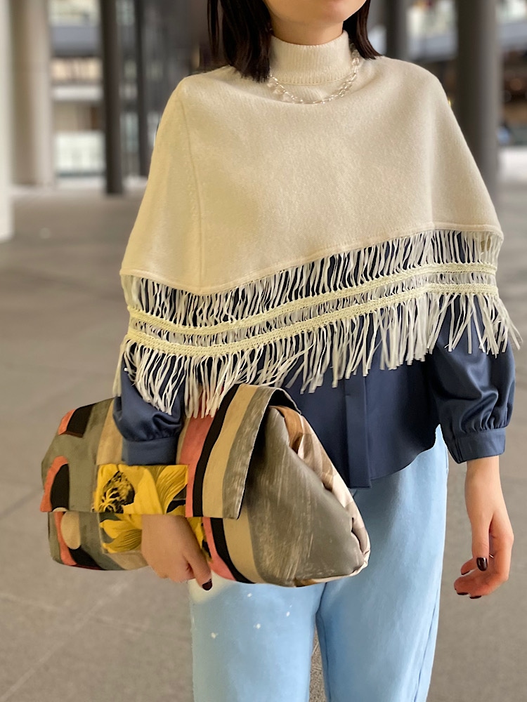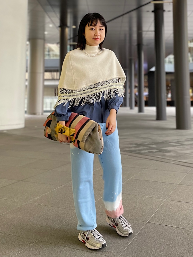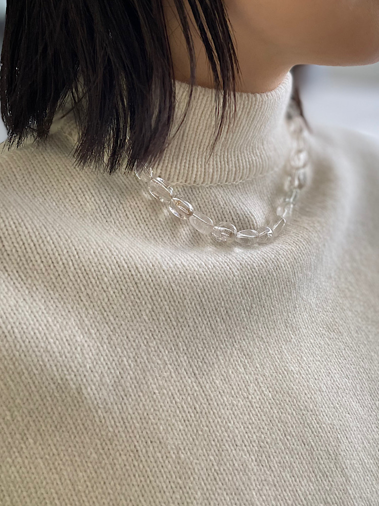 ハイネック+パールボタンでアクセなしでも華やかになる