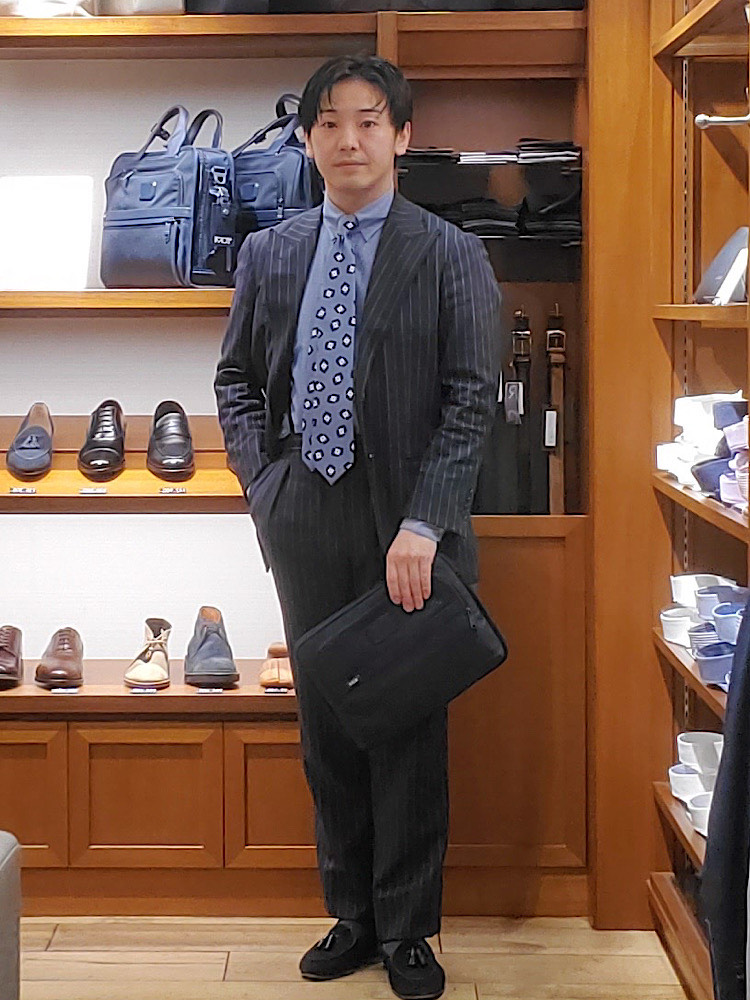 ブルートーンで統一感を出してキレイ目にしつつネクタイで遊び心を演出