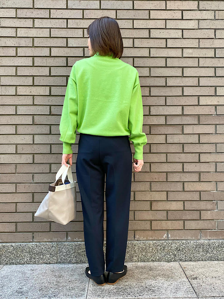 鮮やかなライトグリーンのニットをきれいめにコーディネート