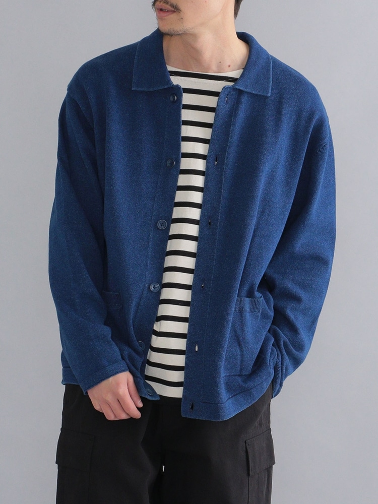 ポロカラーのインディゴニットを主役に、サンダルでラフにコーディネート。