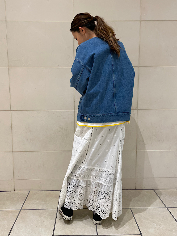 デニムジャケットと言えば、カジュアルの定番アイテムですが首元のフリンジなどしっかりガーリーなところが◎
