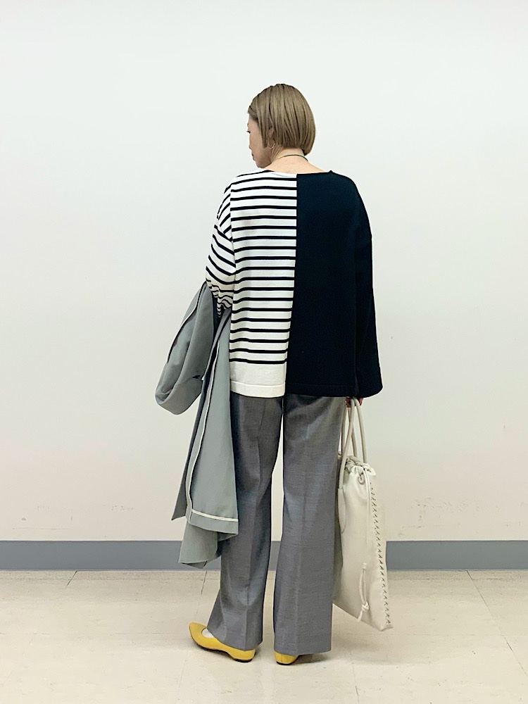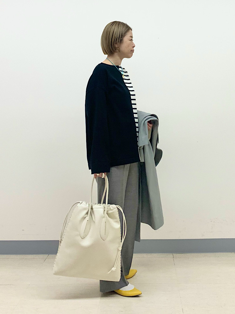 【サイズ感】大きめ。オーバーサイズですが、だらしなく見えないアームホールと身幅のボリュームで、着やすいゆとり。気温の低いときは、厚みのあるニットを着ることもできます。