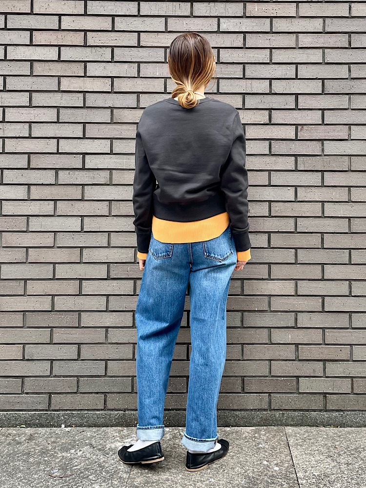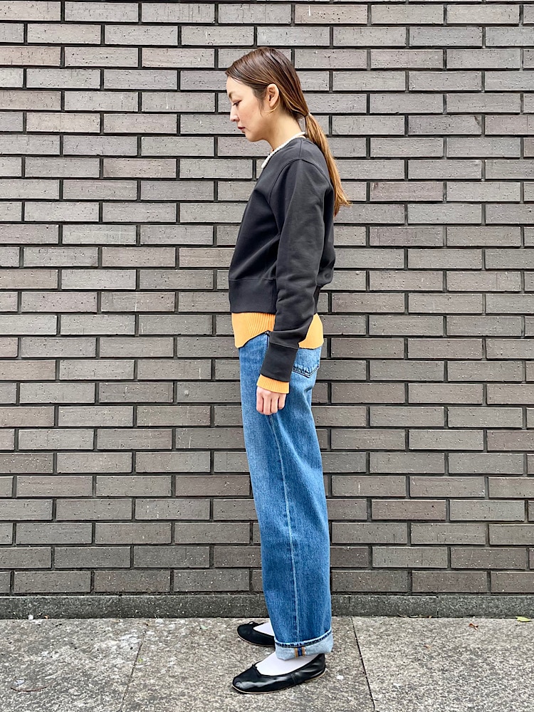 素材感・着心地:コットン素材のスウェット。あまり厚みはありません。ボリュームのあるボトムとの相性が抜群ですが、長めのインナーをレイヤードするのもおススメです