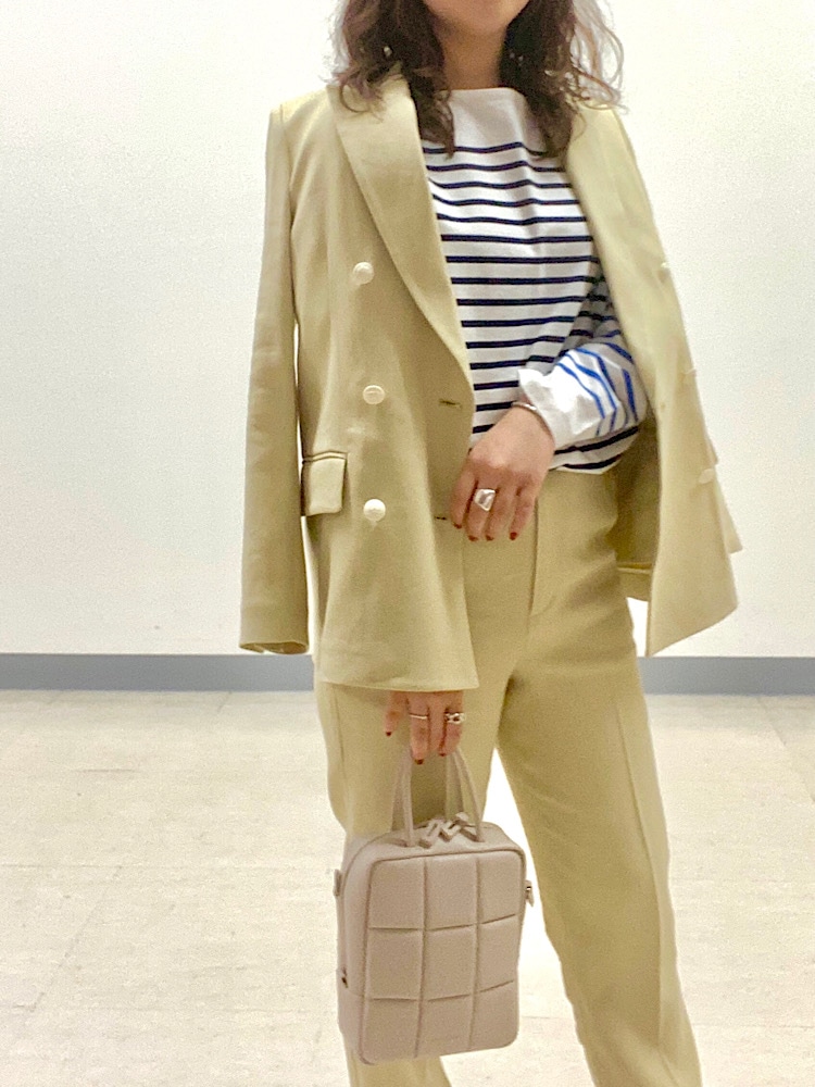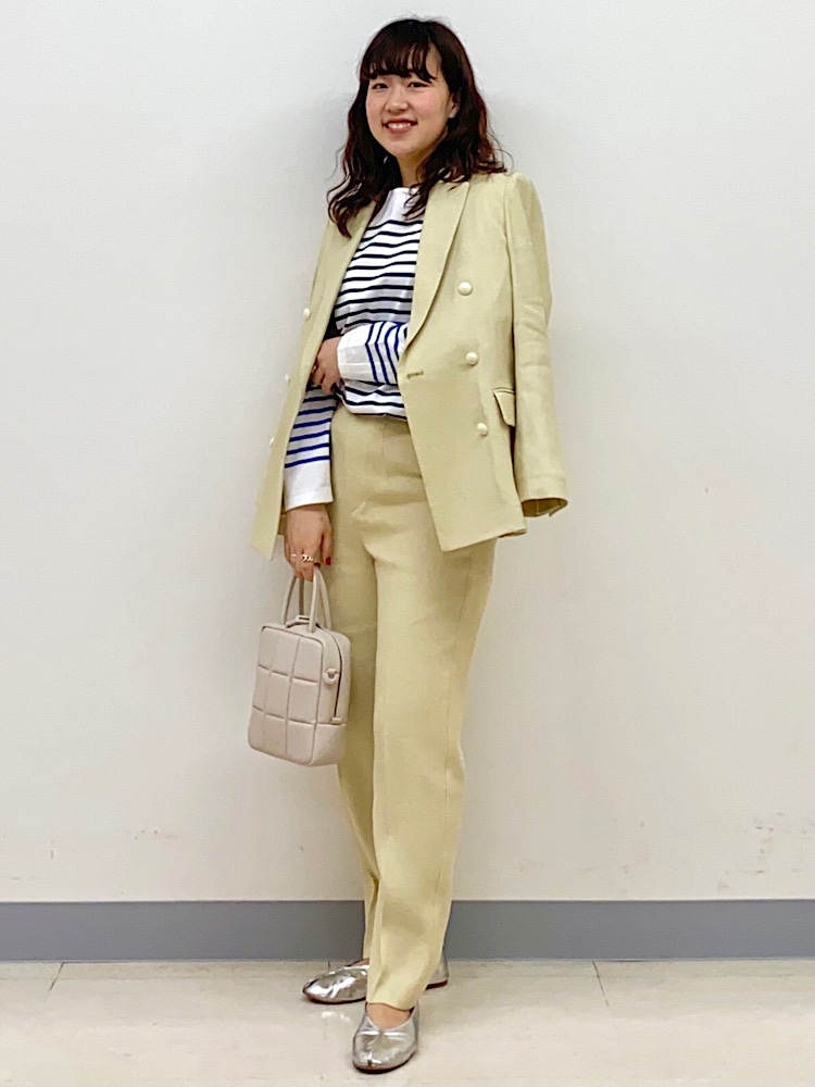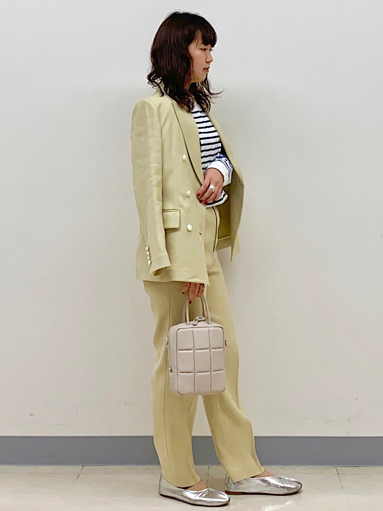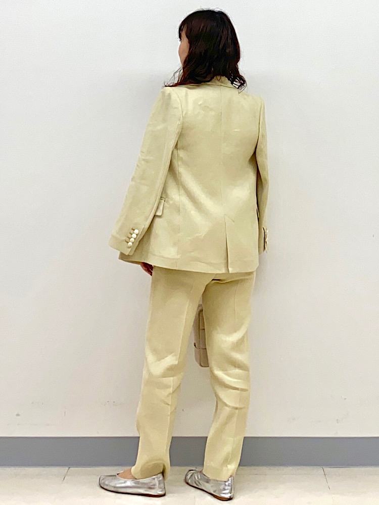 着心地:生地がリネン混のお素材なので春夏のジャケットスタイルに是非。ハイウエストなのでコーディネートが締まって見えます。