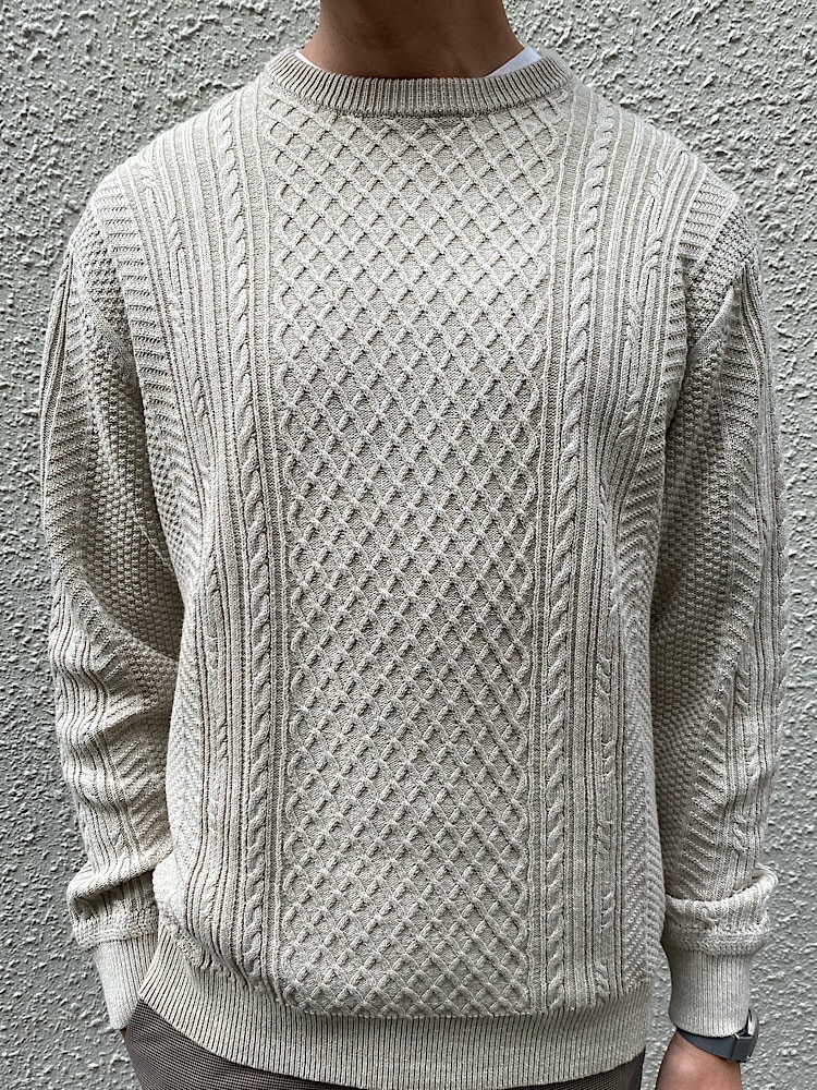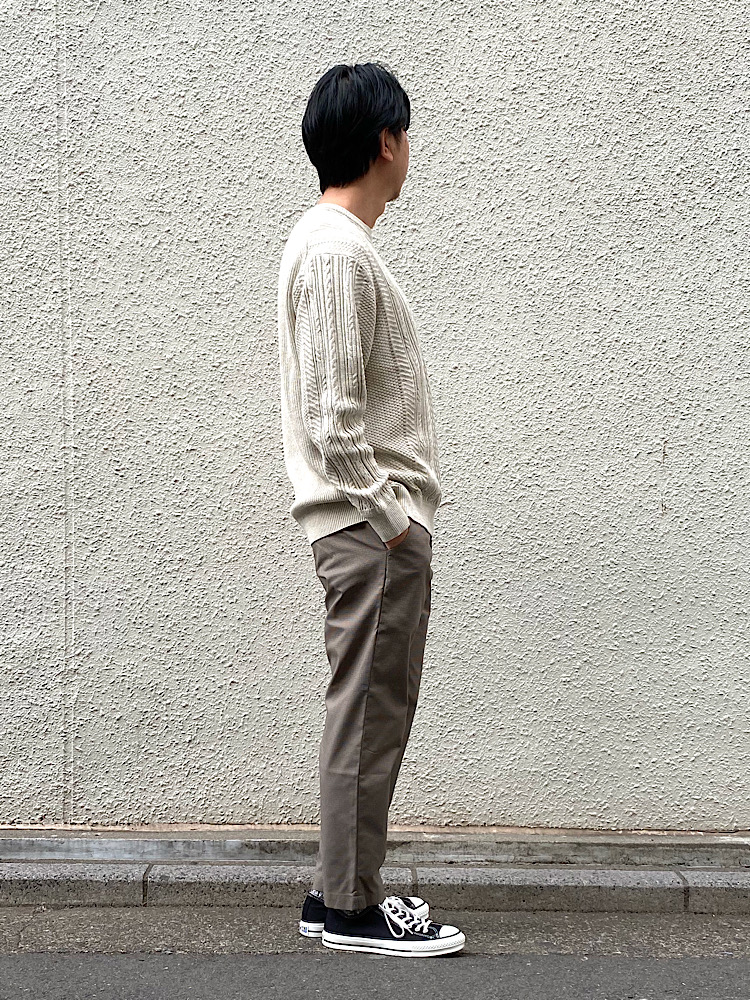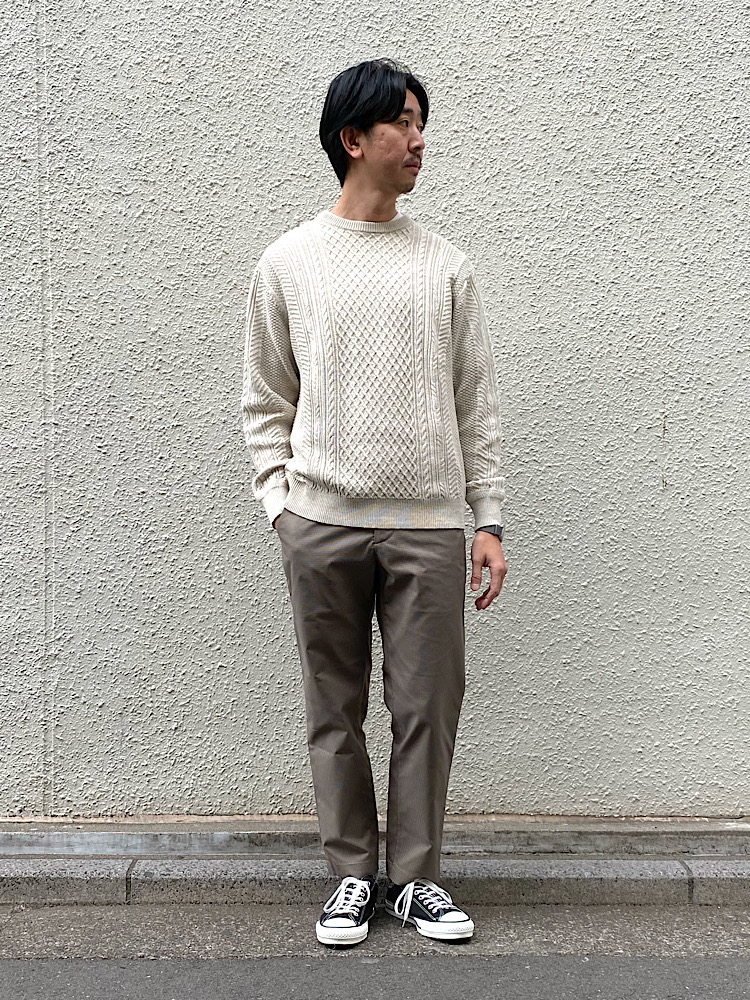 素材感/着心地:定番ニットのコットンバージョンです。フィッシャーマン柄でカジュアルに取り入れ易いです。