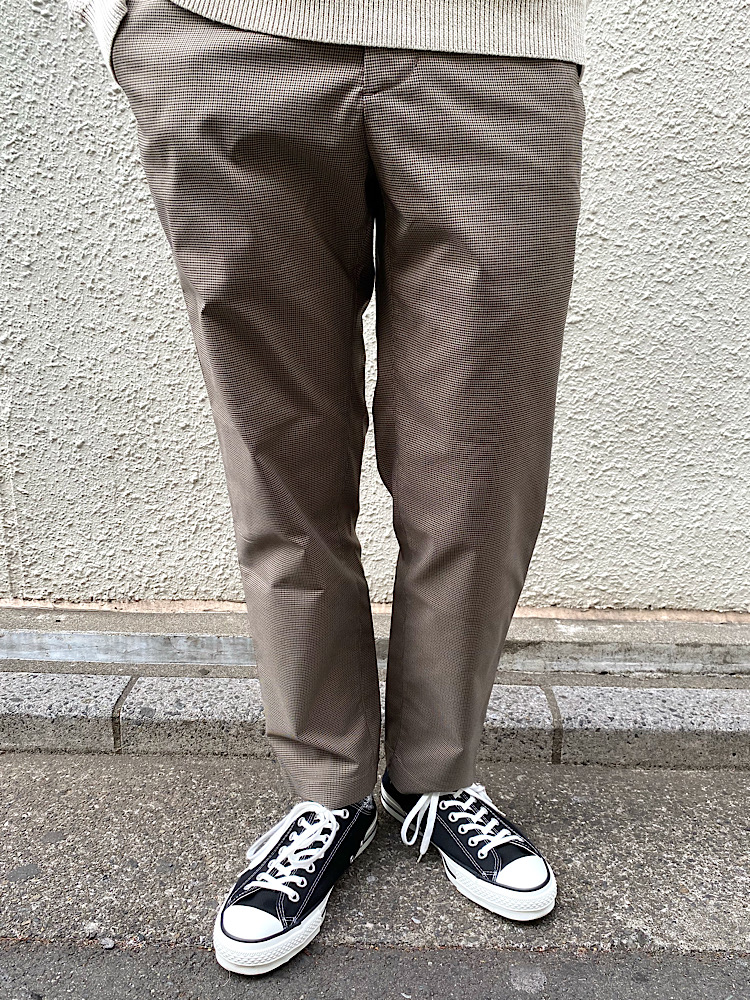 定番のフィッシャーマンニットのご紹介です。素材感が新鮮なガンクラブチェックのパンツです同系色のコーディネートです。