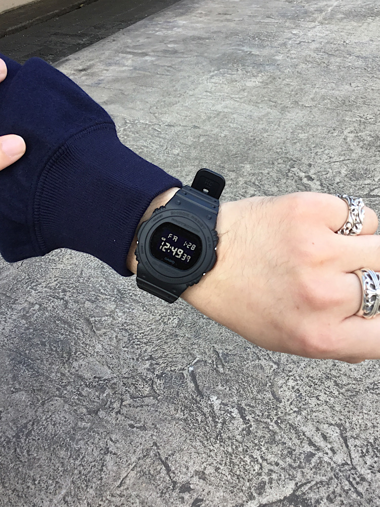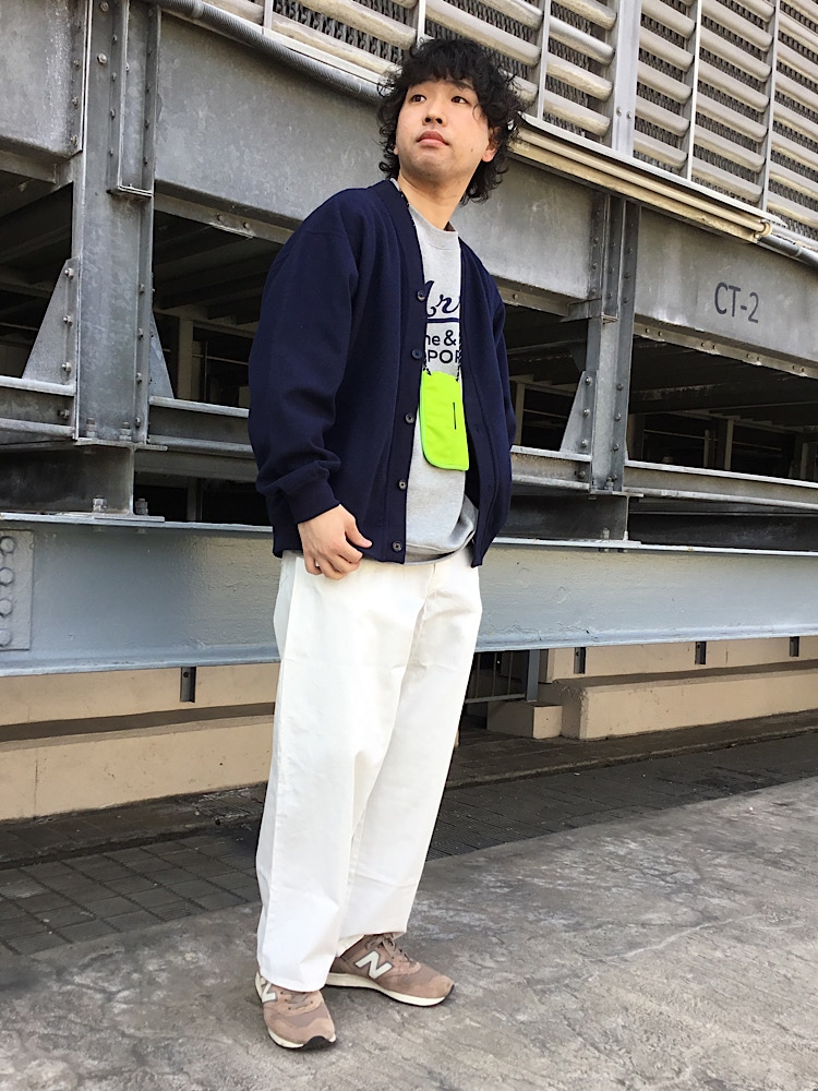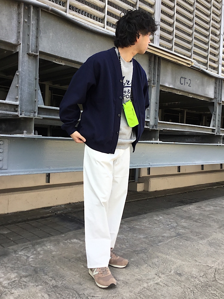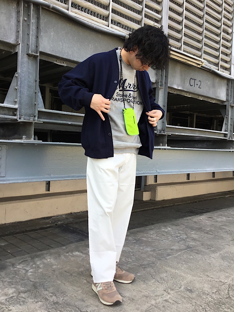 今回はポンチのカーディガンを羽織ってインナーには新作のカレッジスウェットを着ています。