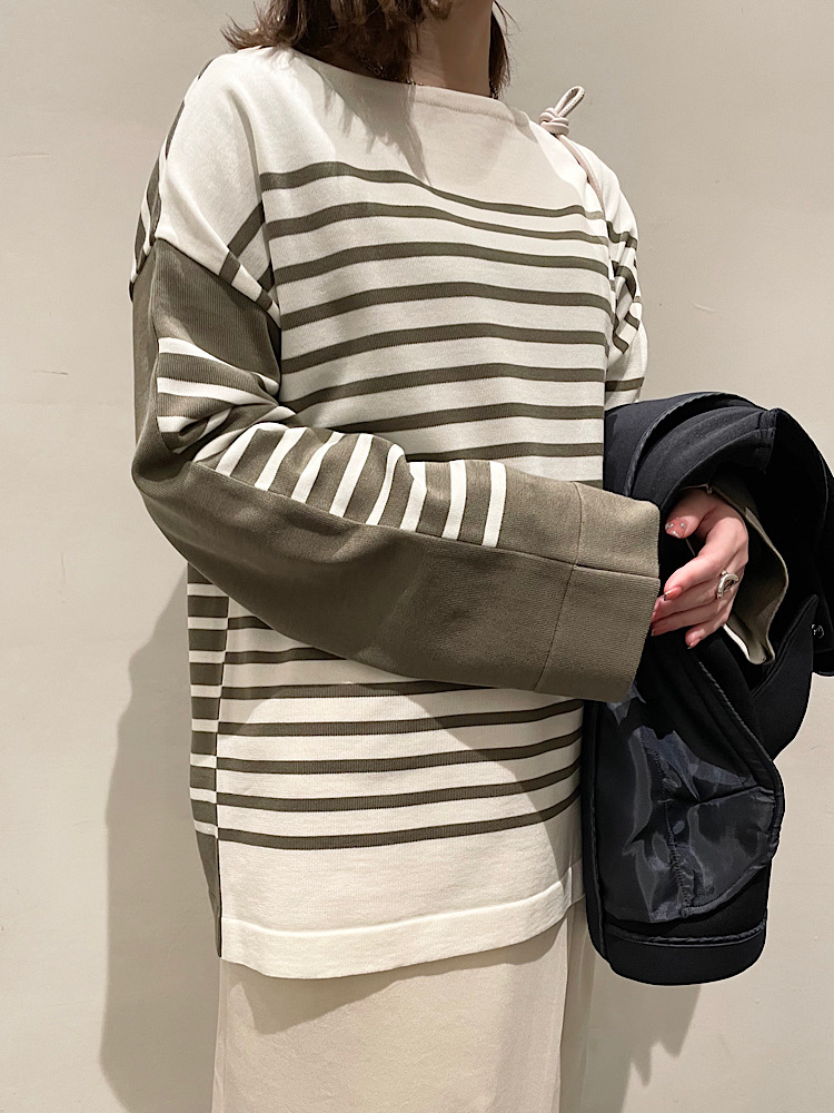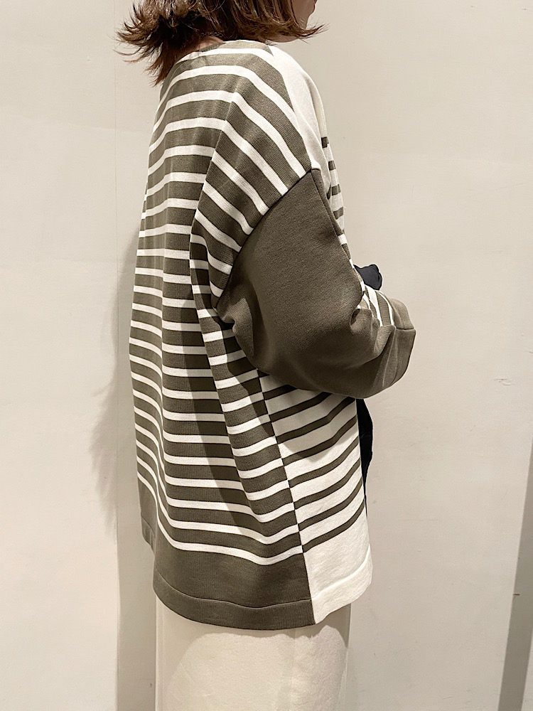商品紹介:カットソー見えするニット素材のボーダーカットソーです。デザインが後ろと前とてま色が違うので1枚でも決まるアイテムです。