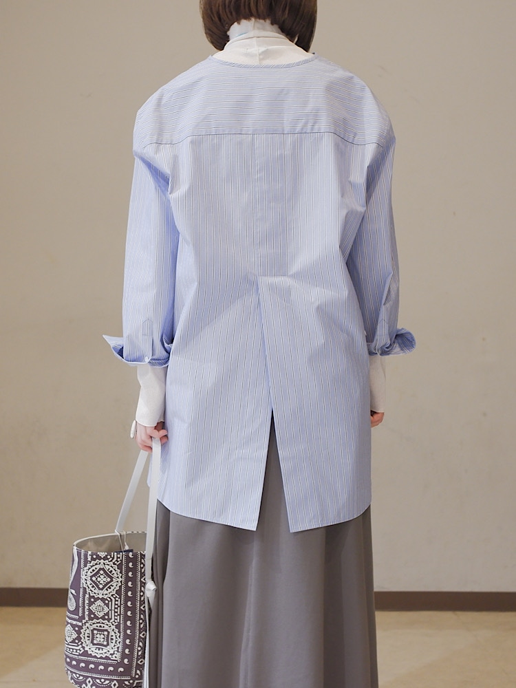 ◆ Primary Navy Label ストライプノーカラーシャツ