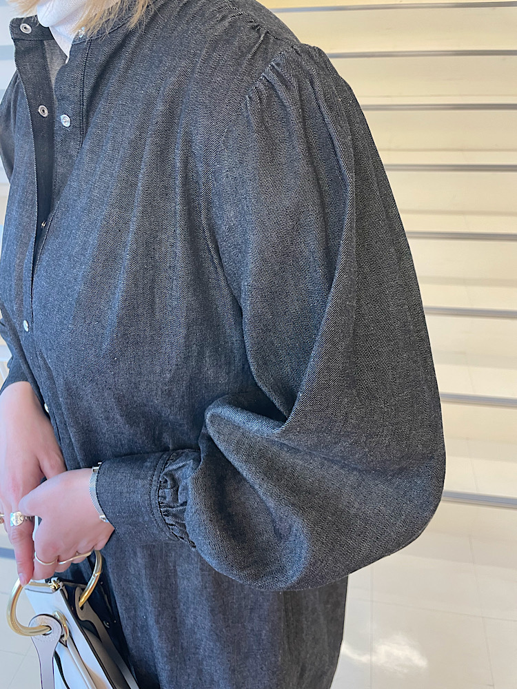【素材感・着心地】デニム生地。肩から袖にかけてボリュームがある。