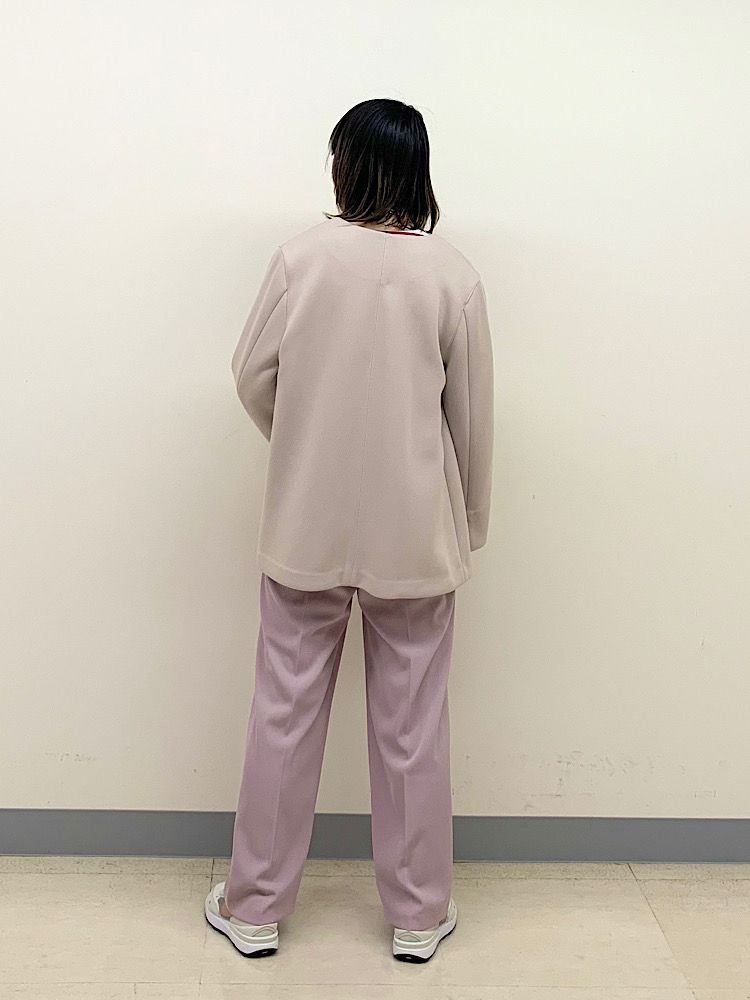 着心地:若干ツヤ感ある生地で、初夏まで履けそうなパンツ。
