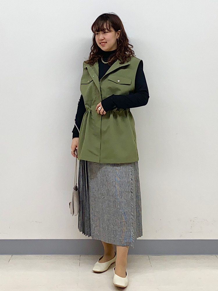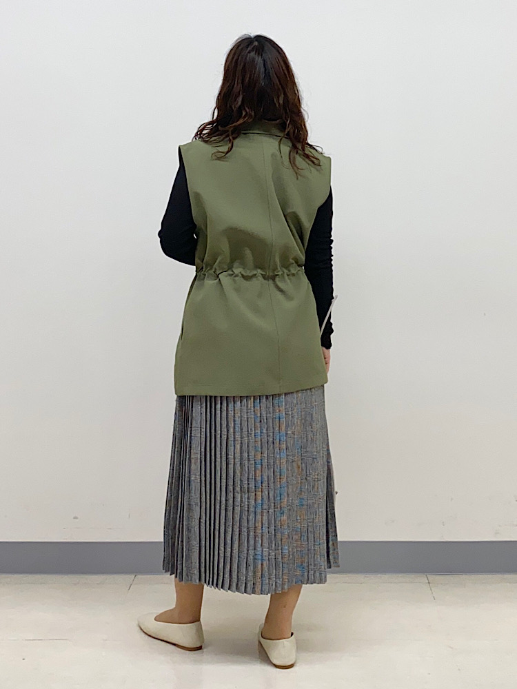 カジュアルなデザインに綺麗目な素材のジレとラップスカートの組み合わせ。