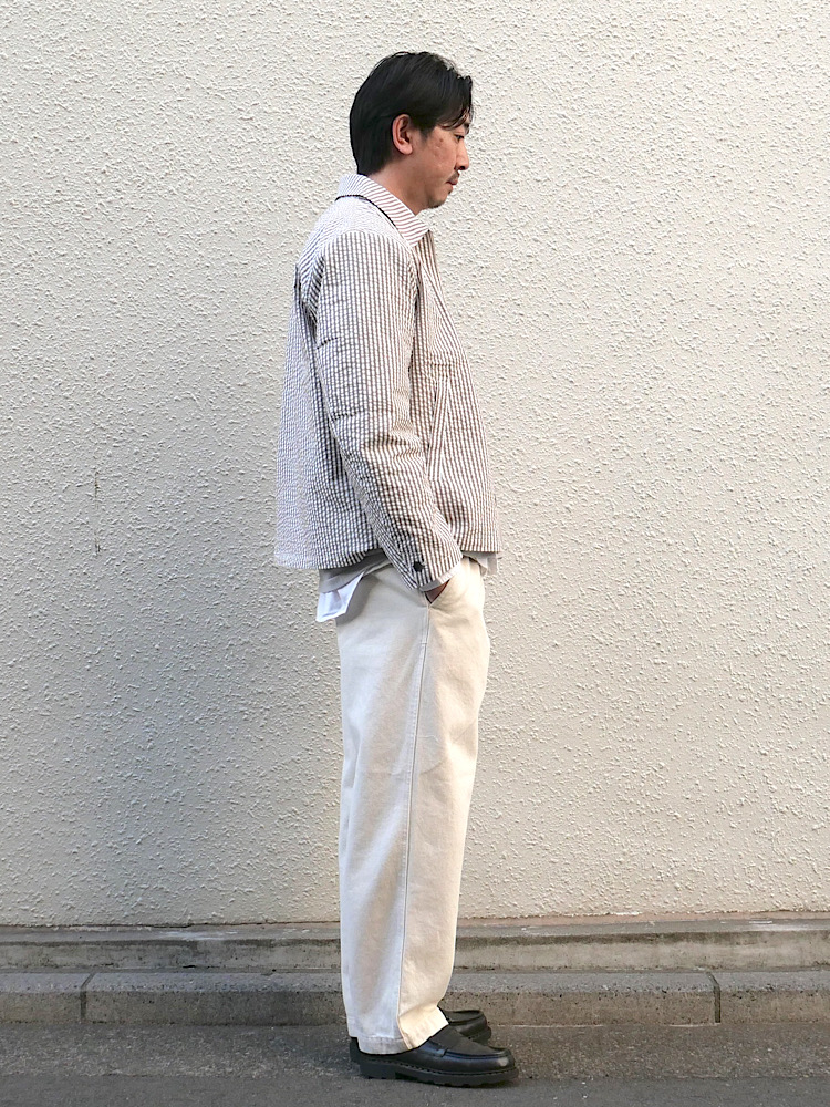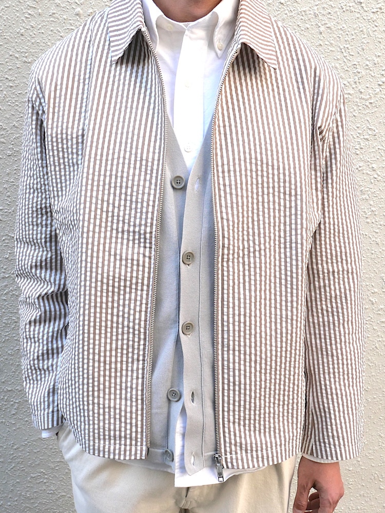 春色シアサッカーブルゾンのご紹介です。全体をワントーンでまとめています。